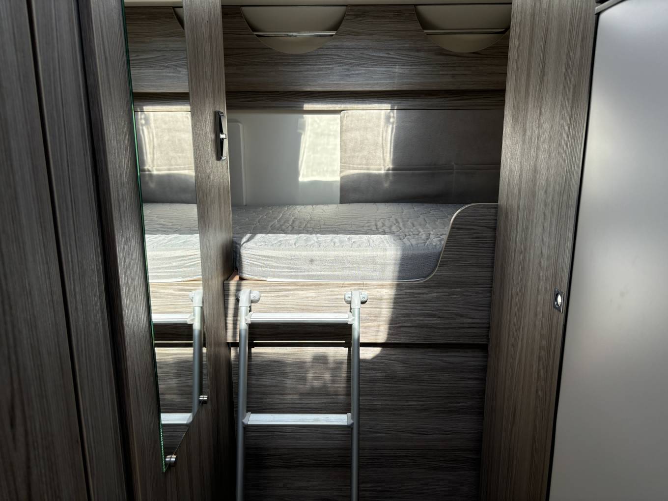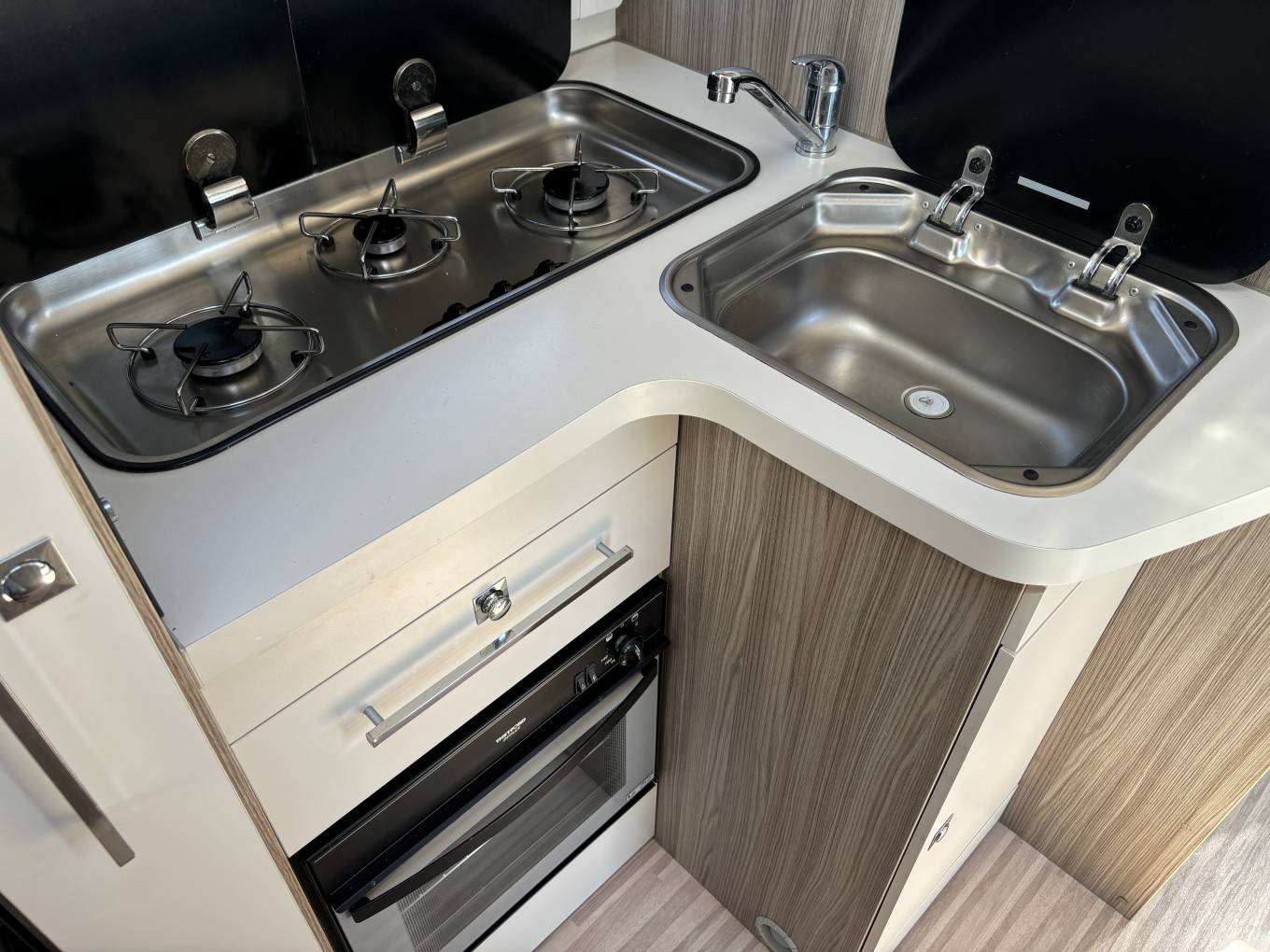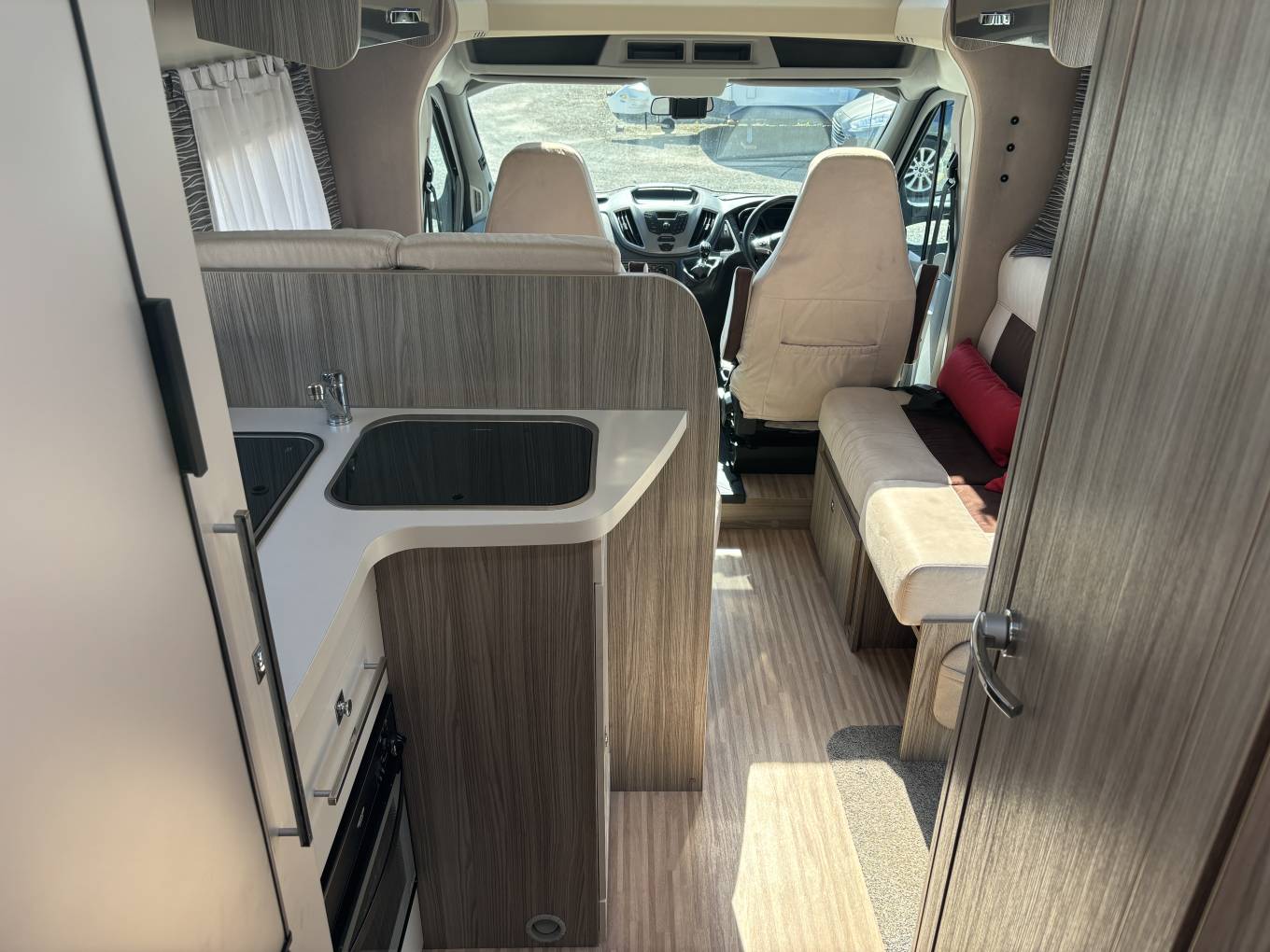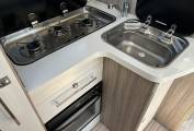 The habitation area utilises space very well with bunk beds at the rear, the bottom of which can be lifted up to utilise the large garage which can be accessed from both sides. The washroom just in front of this has the usual sink, toilet and a decent sized separate shower, and the kitchen is fitted with sink, 3 gas hobs, oven, grill and a large fridge freezer so you can stock up for those long trips away.