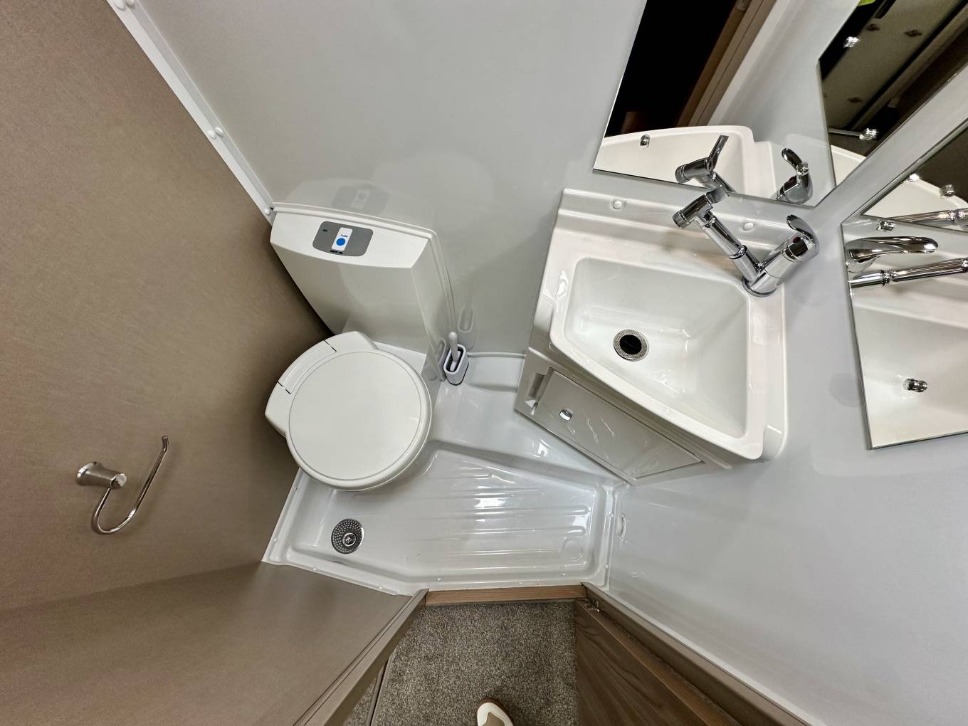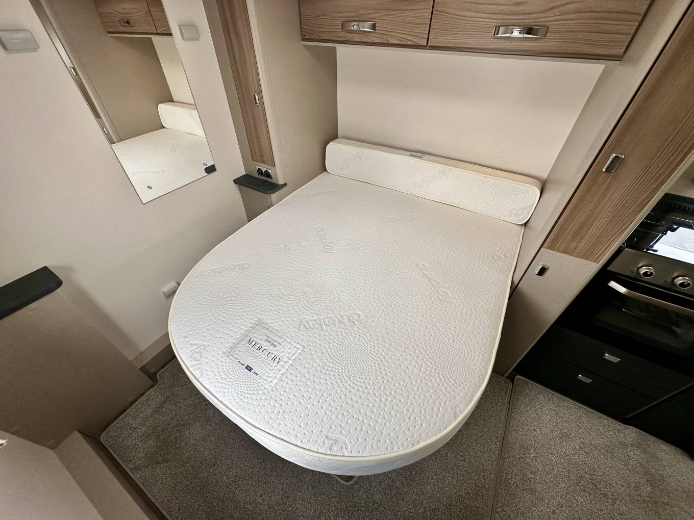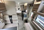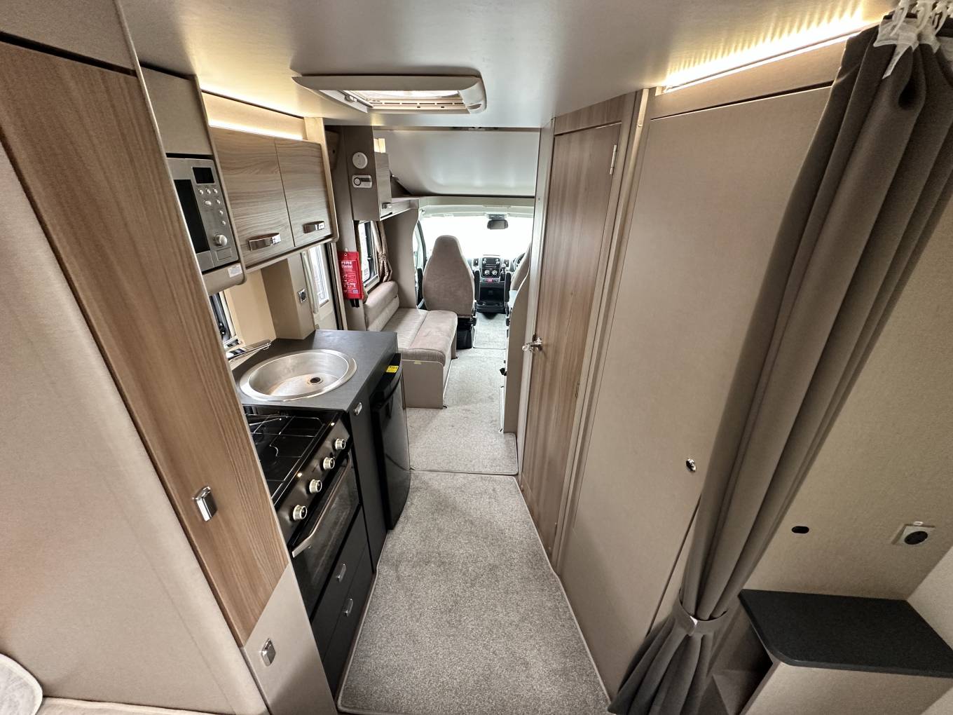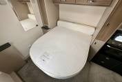 To the rear you will find the desirable fixed rear island bed which comfortably sleeps 2. There is ample storage including two wardrobes either side of the bed, overhead and under bed storage which can be accessed inside or outside of the motorhome. Moving forward, you will find the well equipped kitchen including stainless steel sink with mixer tap, 3 burner gas hob, oven, microwave, 3 way fridge with freezer compartment, extendable work surface and plenty of storage. Adjacent, is the practical washroom with wash basin, electric flush Thetford toilet, shower and vanity storage. At the front of the motorhome, is the dinette area with swivel seats and side bench providing generous seating for all the family. There is a comfortable drop down, double, cover cab bed which completes this 4 berth motorhome.