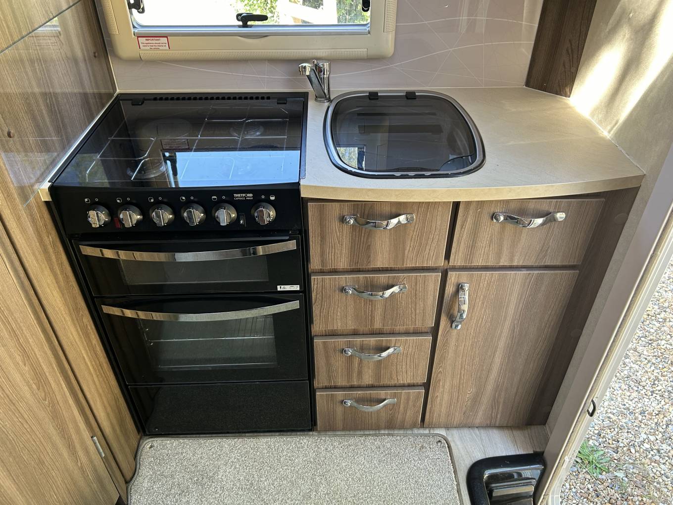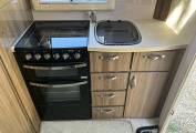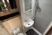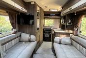 Step inside the motorhome and there is a surprising amount of space. The layout consists of an end kitchen which is equipped with everything you need to rustle up great food on the go. You have a dual-fuel hob with one electric hotplate and 3 gas burners, an oven and grill as well as a microwave. The Thetford fridge has a decent size freezer box and above the fridge is an area that can be used for food preparation and there is even an extension leaf as well.