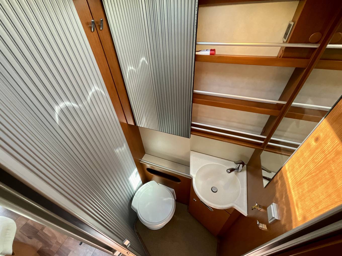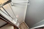 Towards the rear, the washroom and toilet/sink area are separate on either side of the motorhome. The shower is spacious and modern. The toilet is a Thetford toilet with cassette, and the washbasin is accompanied by a large vanity unit.