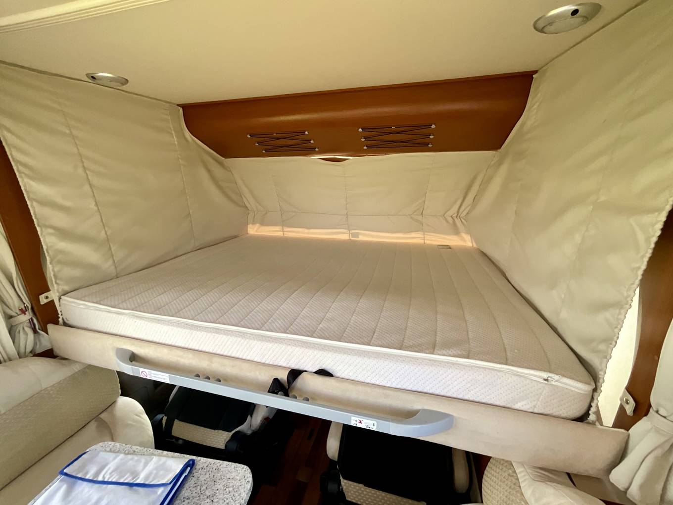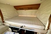 This lounge is spacious, and coupled with the twin swivel seats, can comfortably seat six around the table for meal times and socialising. A slide out TV lifts up behind the offside bench. At night, a spacious overcab bed drops down over the driver and passenger seats.
