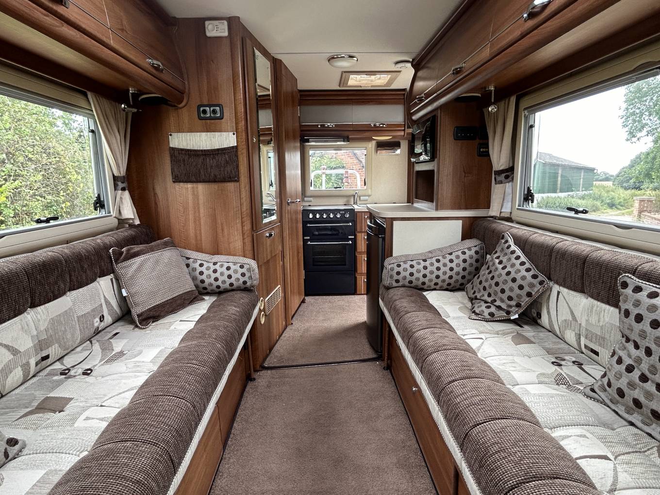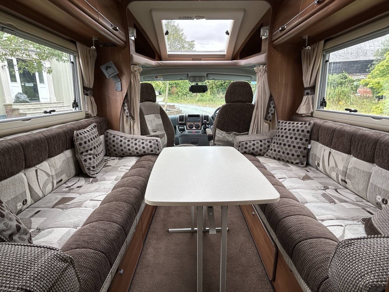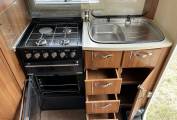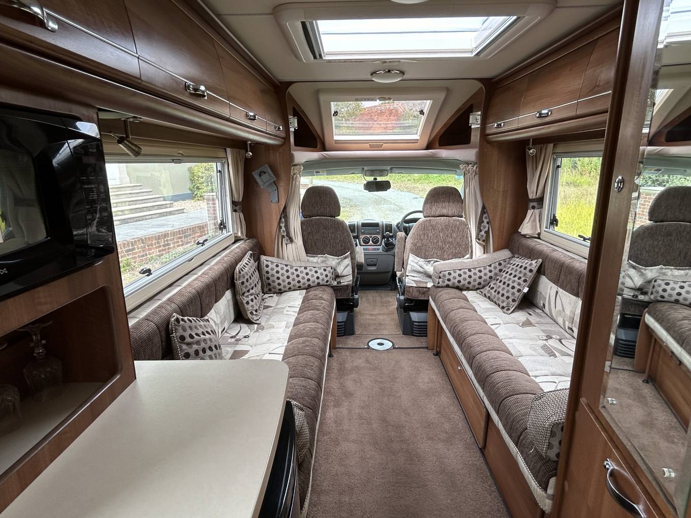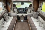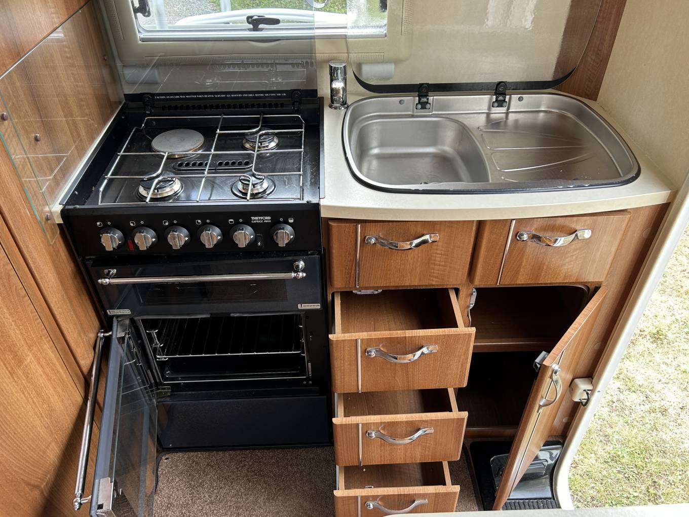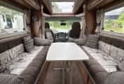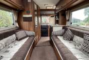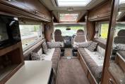 Creating nice meals on your trips away should pose no problems as the kitchen is impressively equipped with a microwave oven, an oven and grill, dual-fuel hob with an electric hotplate and 3 gas burners and a Thetford fridge freezer.