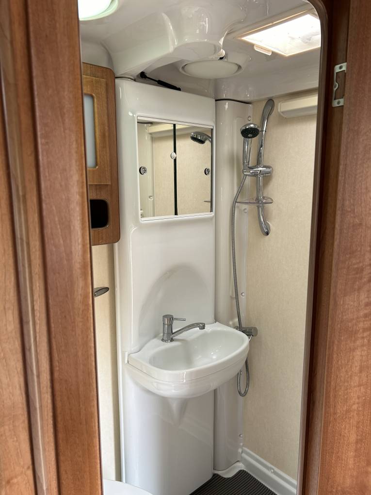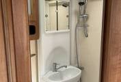 The washroom is well equipped and has all you need to keep fresh on your travels. It features a swing wall which unclips to create a separate shower area with a perspex screen door. There is a Thetford cassette toilet, a wash basin with a mixer tap, two bathroom cabinets for your toiletries and a skylight.