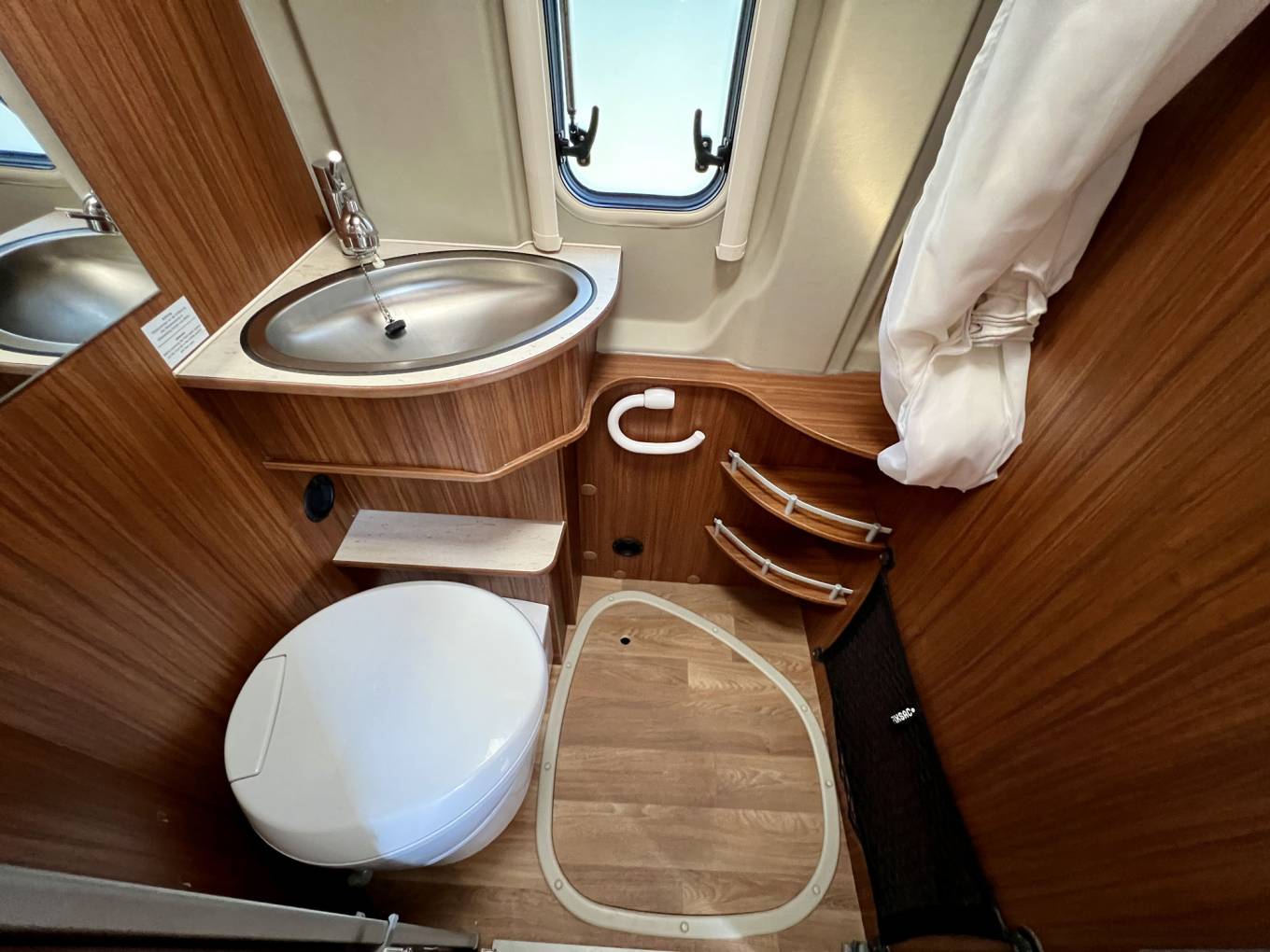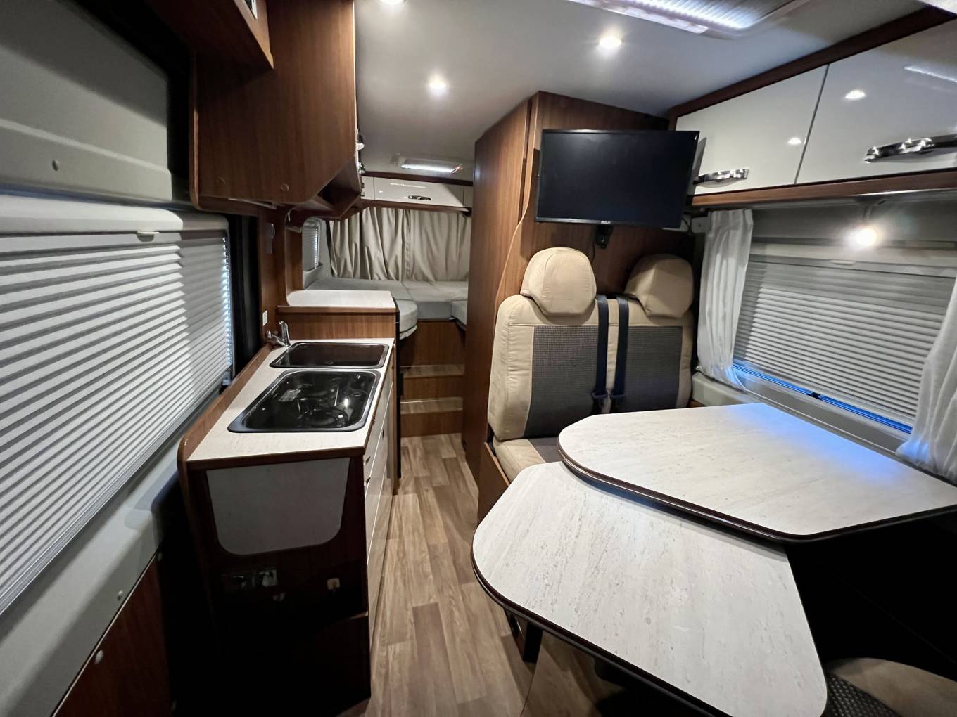 Onboard systems include fresh and waste water tanks, dual fuel heating and hot water, kitchen wtih large fridge with freezer box, 2 burner gas hob, washroom with vanity sink, toilet and shower. The forward dinette employs the swivel cab seats opposing the fixed dinette seat, across a central table with swing out extension. There is a vast array of storage including cubbyholes and underfloor compartments, plus of course the rear underbed store. Other inboard features include 2000W inverter, twin leisure batteries, 12V TV, multiple USB points, custom made removeable carpets. Blinds and flyscreens are fitted to all habitation windows and a large flyscreen slides across the main habitation door.