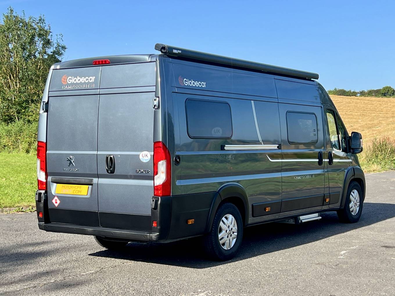 Up front the Peugeot Boxer offers plenty of power, 6 speed gearbox, cab air conditioning, cruise control, media unit with DAB radio, satnav and reversing camera, integrated night blinds. Outside, you will find a roll out sun canopy, access to water and electric service points, roof mounted solar panel. A nice specification touch is the electric soft close sliding door, with electric step underneath.