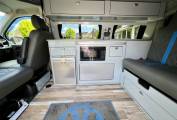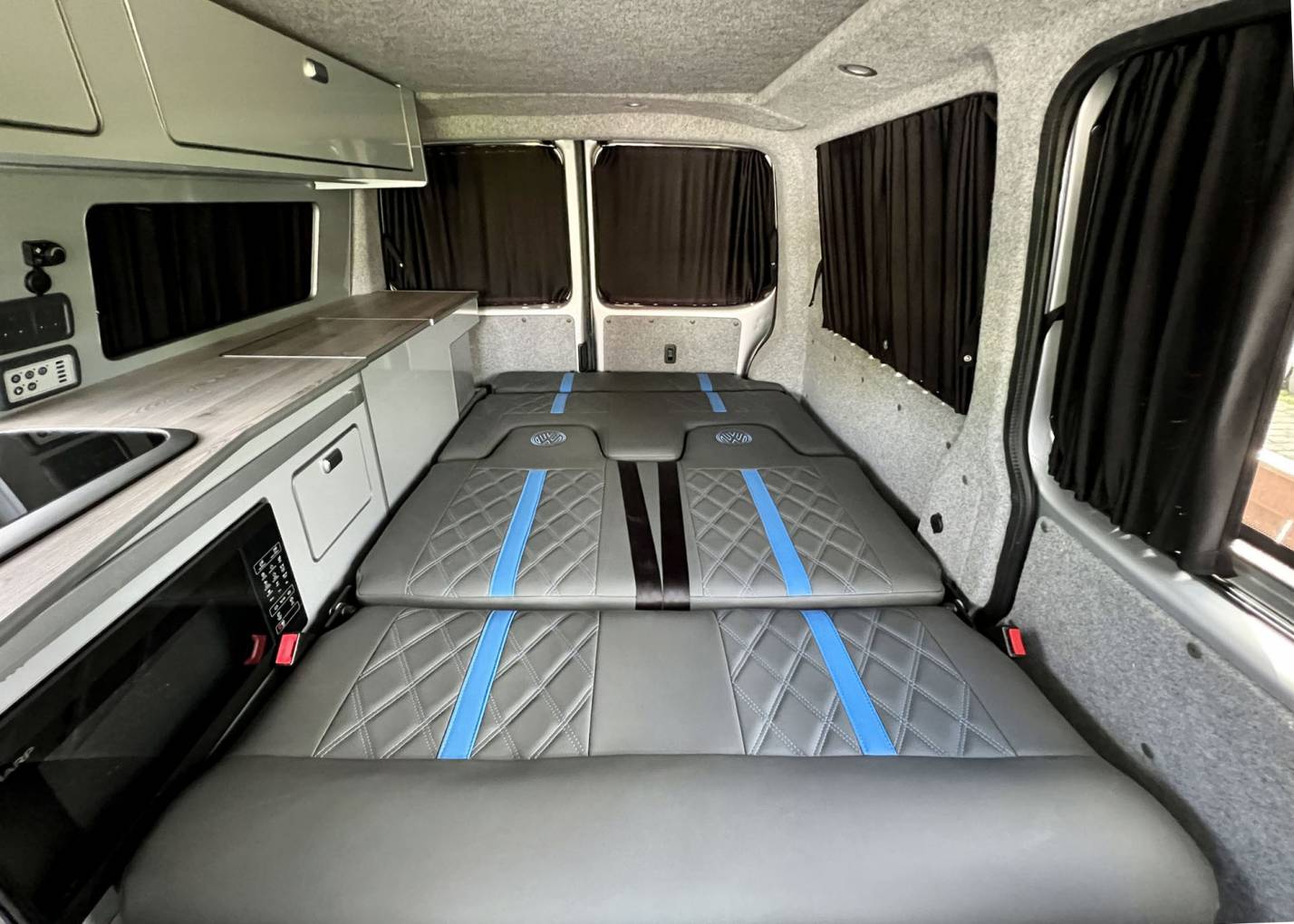 Attractive throughout, having a stylish grey and silver interior with blue detailing, the Accura makes for a light and pleasant living space. The standard of fit, finish and upholstery throughout is high and the Vanworx rock and roll bed is strong and easy to use. All rear windows have blackout curtains fitted, lighting is LED and includes a reading light in the poptop roof bed. Storage is plentiful with no less than seven lockers to help keep living space tidy.
