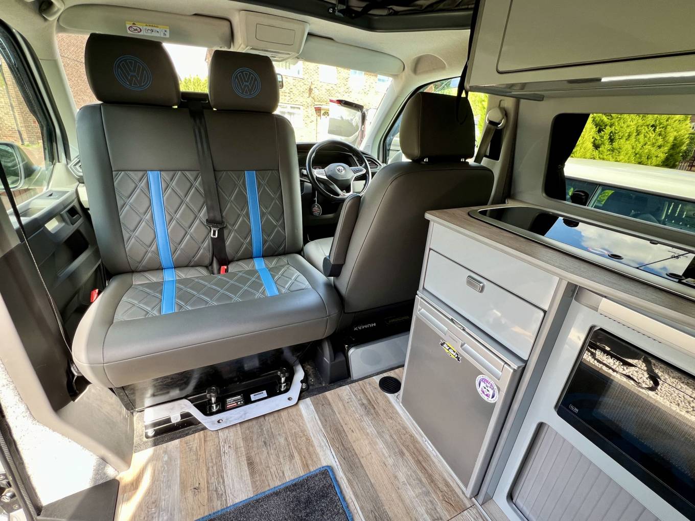The 2.0L TDI engine with the 5 speed gearbox makes for light and easy driving, with cab air conditioning present, VW media system with steering wheel controls. VW online service history is available along wtih independent hard copy evidence of care. Last serviced in September 2024 with MOT until October 2025. Bodywork is in excellent condition throughout and upgraded Wolfrace wheels are unmarked. A Vamoose awning rail is fitted for use with a side annexe.