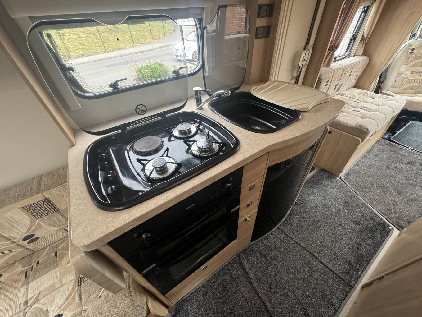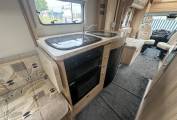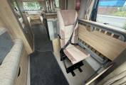 As you step into the habitation area you have a great front lounge area comprising of 2 side facing double seats and two front seats that swivel round. The side facing dinette seats lift up to reveal forward facing seats with seatbelt should you need to transport more than 2 passengers. There is a removable dinette table which is the ideal place to enjoy a meal or snack. As you move back there is an extremely well equipped kitchen area which includes oven, grill, microwave oven, hob with 3 gas burners and electric hotplate, sink with mixer tap and 3-way fridge with freezer compartment. There is also plenty of cupboard and storage space for all your ingredients and cooking utensils.