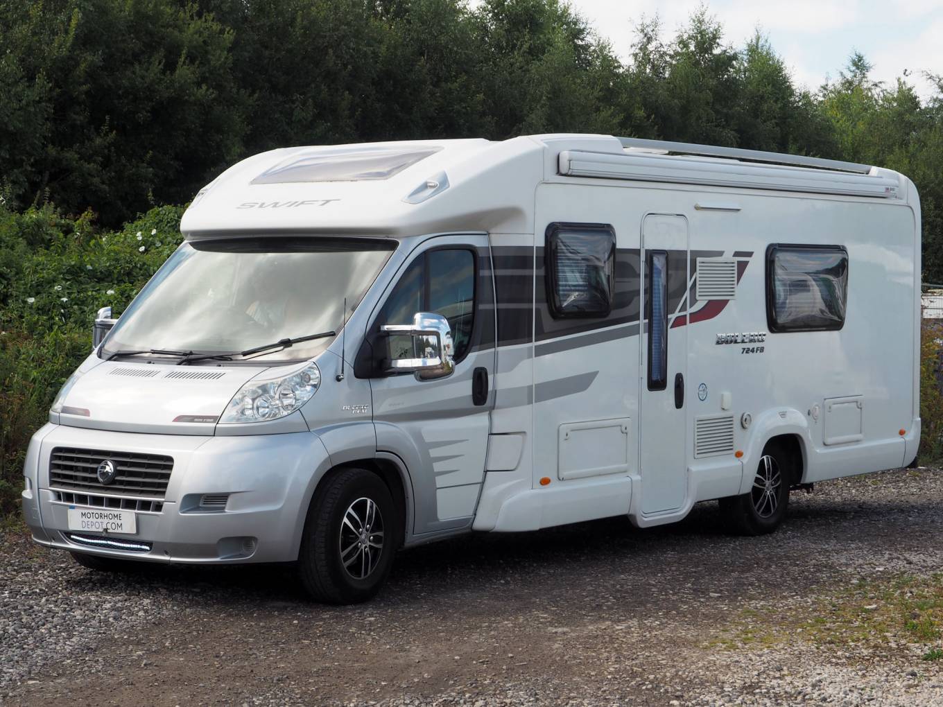 Fantastic specification luxury fixed bed low profile model from Swit, having full central heating, automatic hydraulic levelling, solar panel, rear cycle rack and storage box. This is a 2012 model, first registered in December 2011.