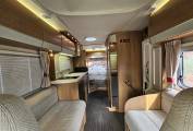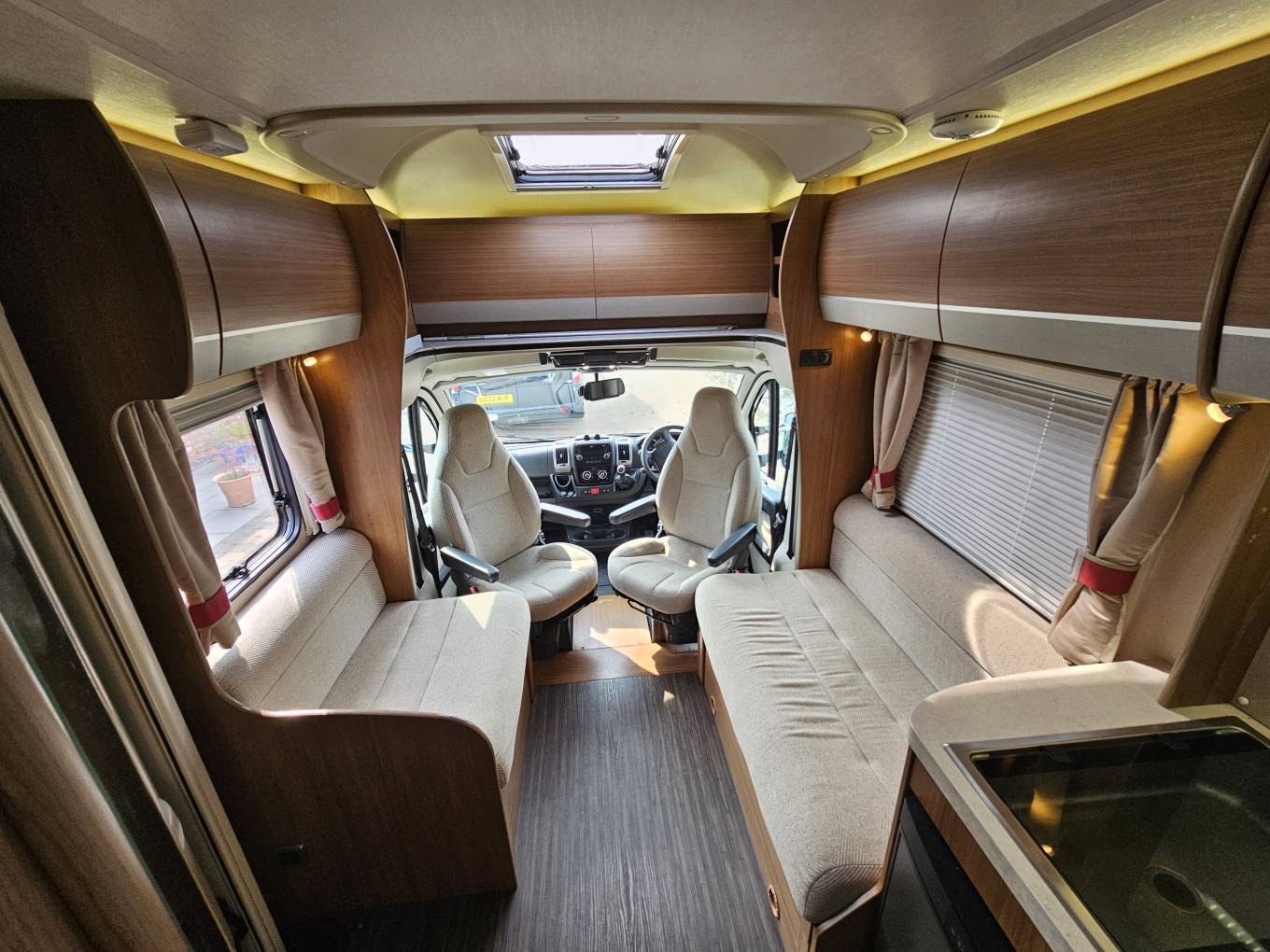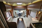 The interior is designed with comfort in mind. At the rear you have a fixed island bed for a proper night’s sleep, and the dinette area can convert into an extra bed if needed. At the front there is a bright lounge with swivelling captain seats, making it a great place to relax.