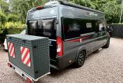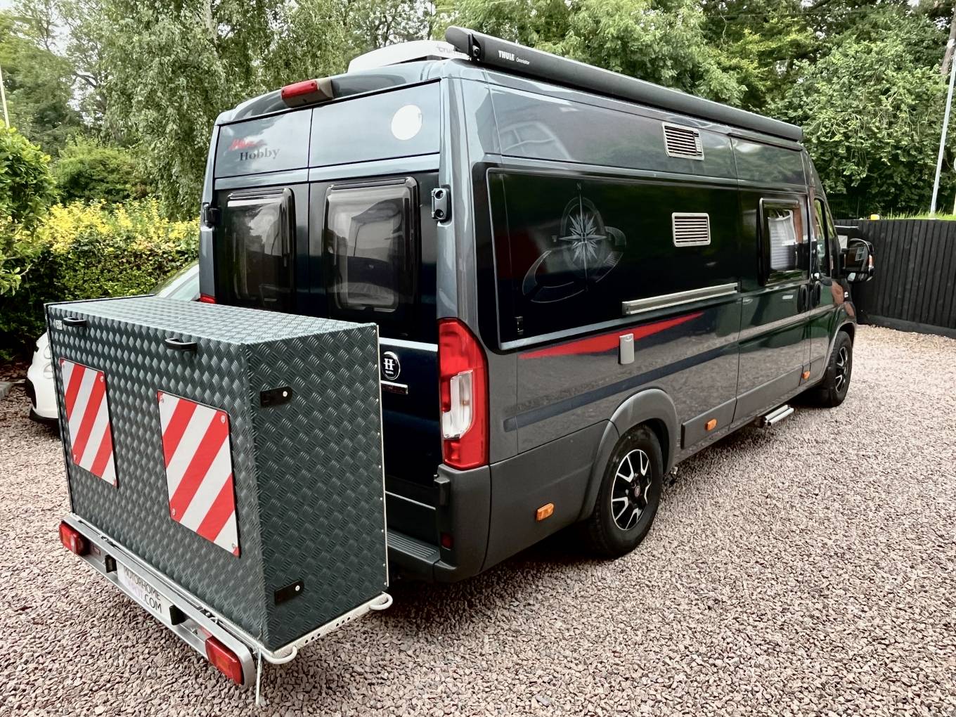 The exterior of the Vantana K65T is in grey slate metallic with colour matched front bumper and black mouldings to the side and rear, this van also has the black mirror protectors, as we look to the rear of the van we have a large storage box mounted to the chassis on sliding rails to sit directly behind the van, but to also allow access to the rear doors when required.