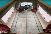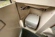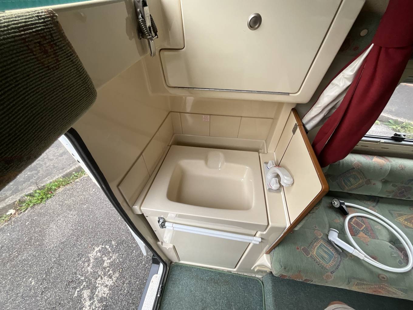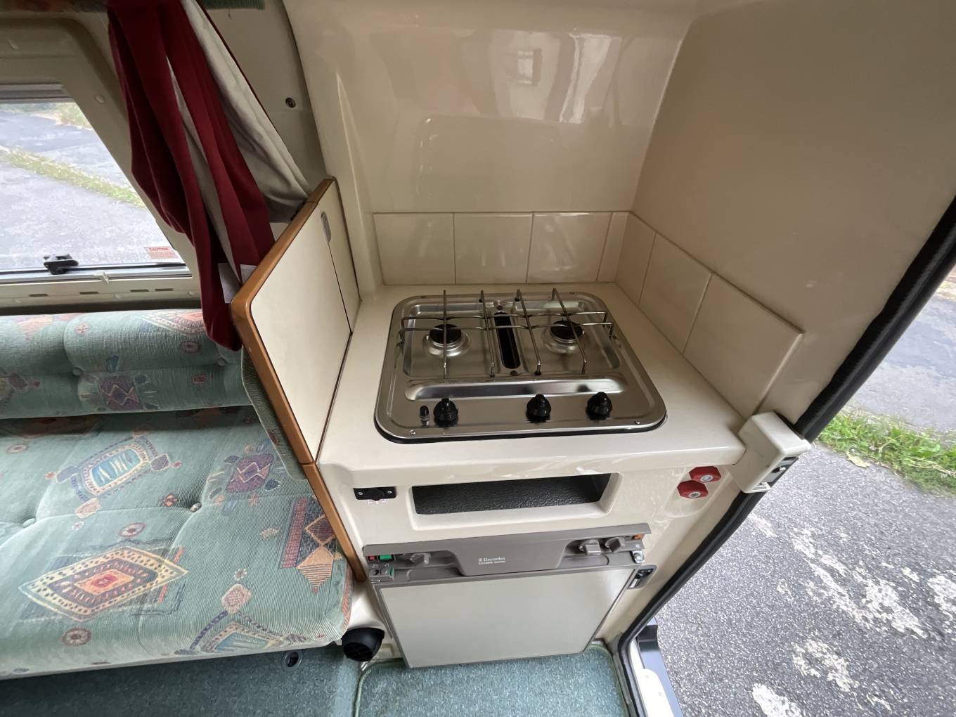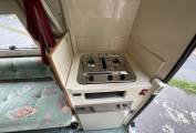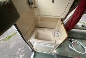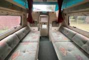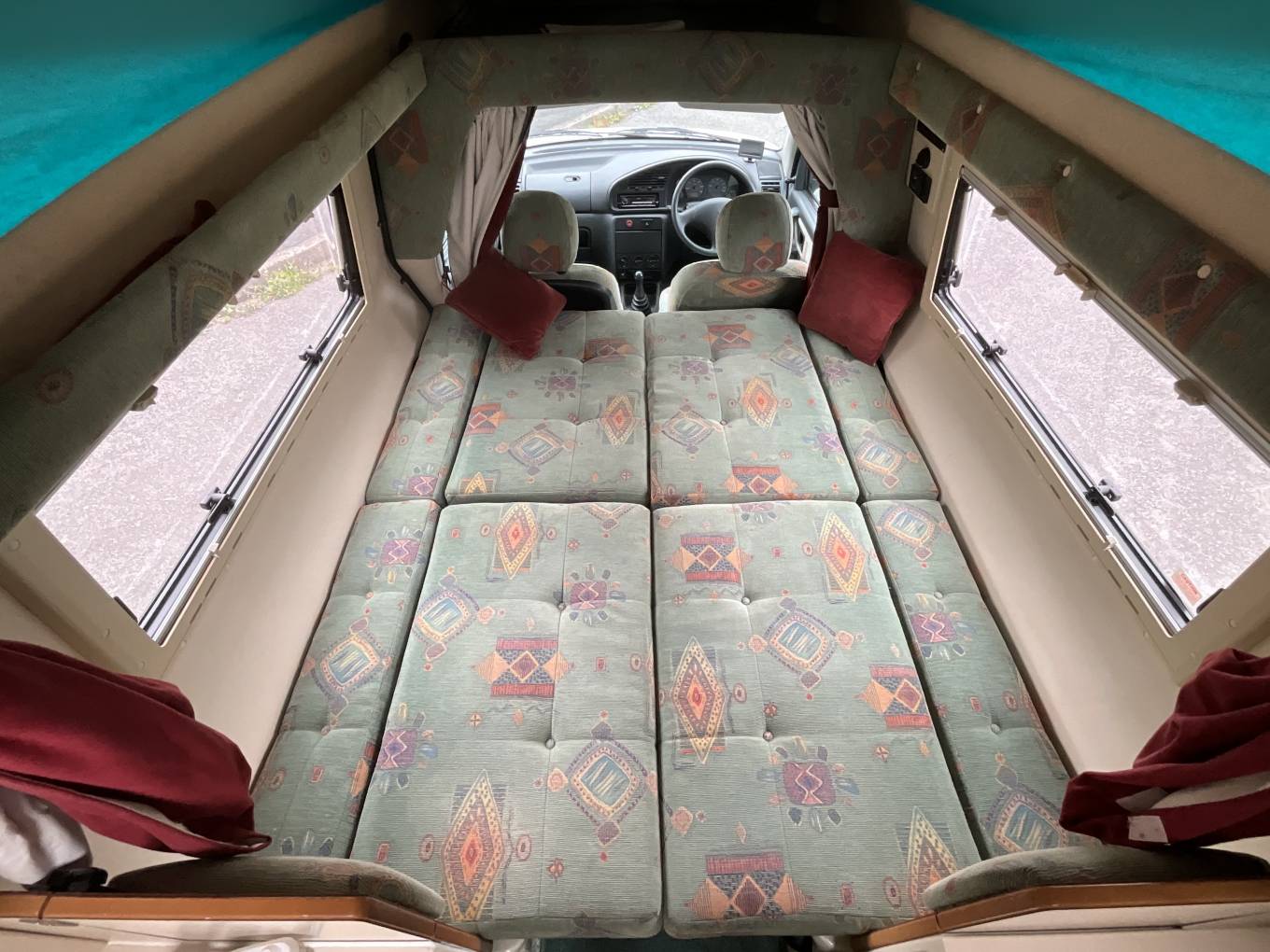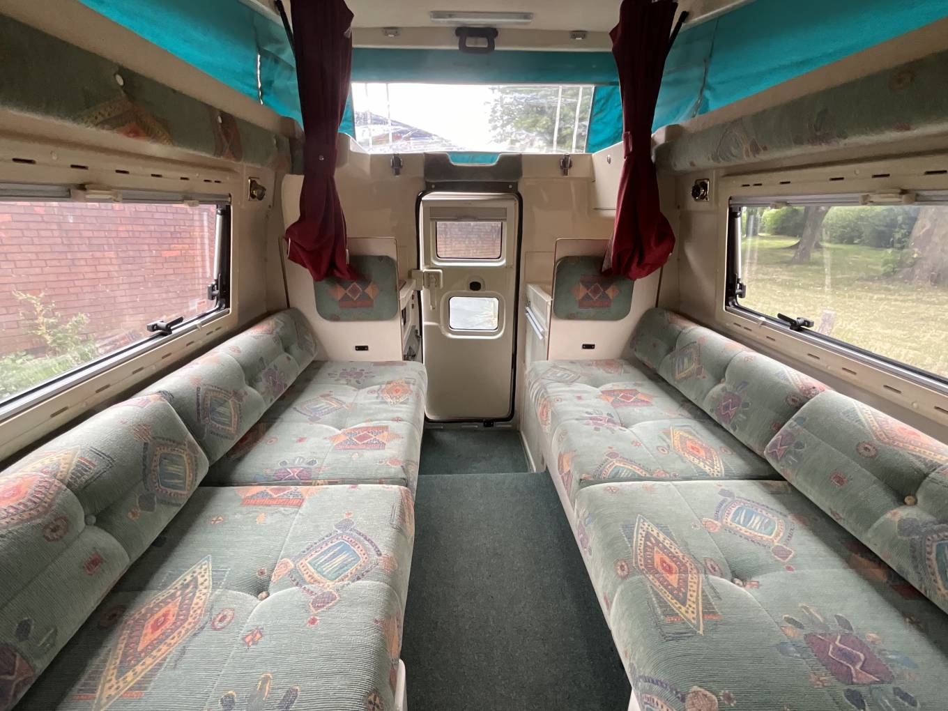 Starting at the rear of the vehicle we have a compact kitchen which features a double hob, grill and generous fridge with ice compartment, opposite this we have a sink with hot and cold water over a porta style toilet. At the front of the vehicle we have two benches for lounging which easily convert to a large double sized sleeping area.