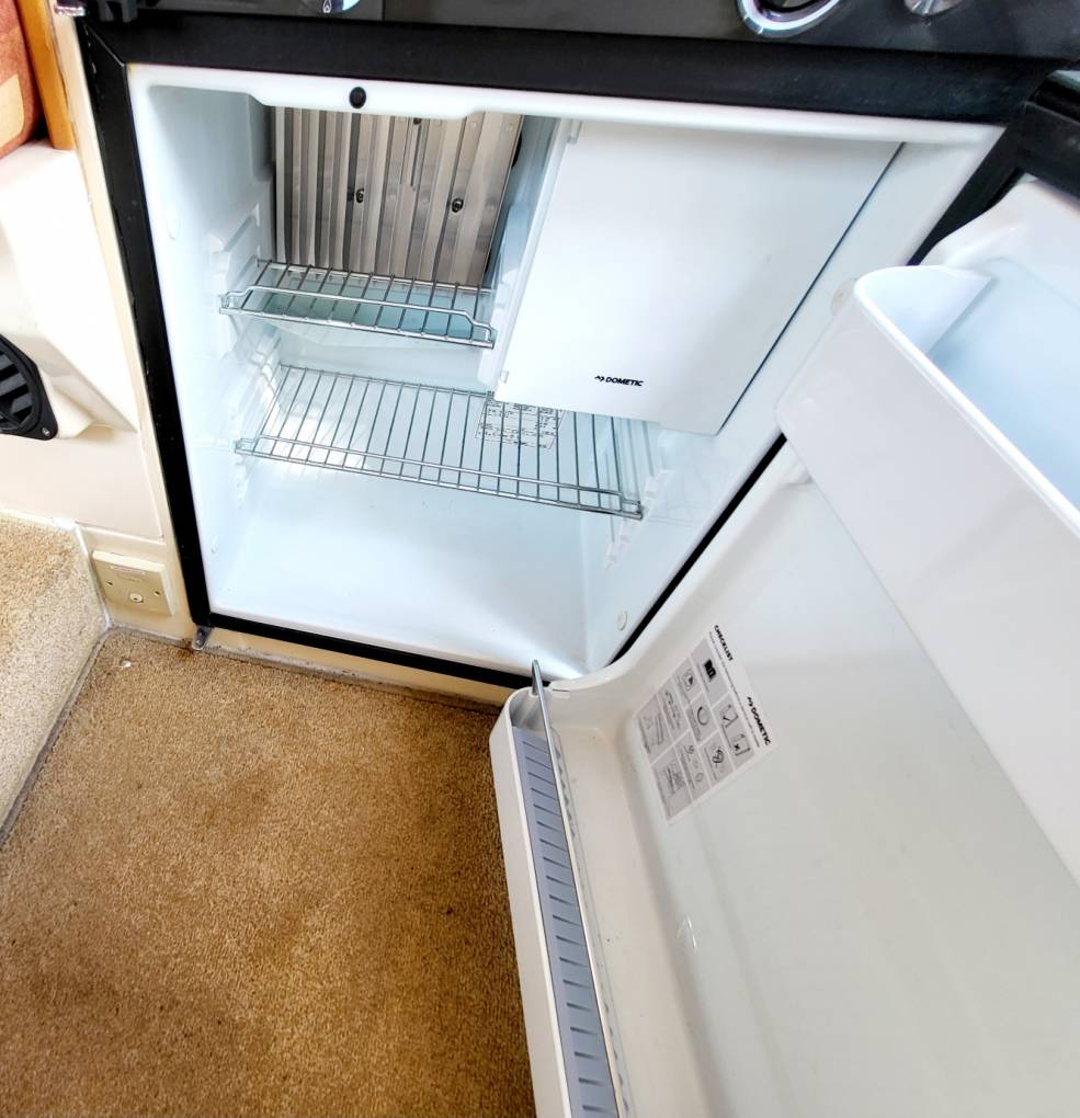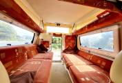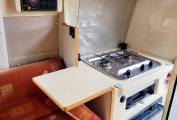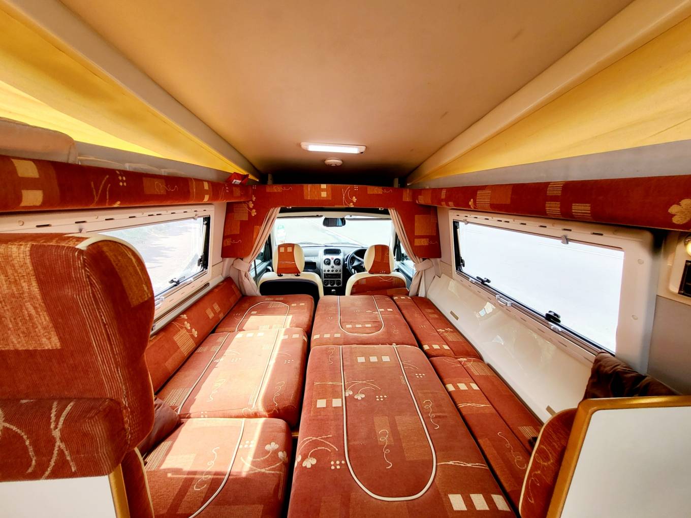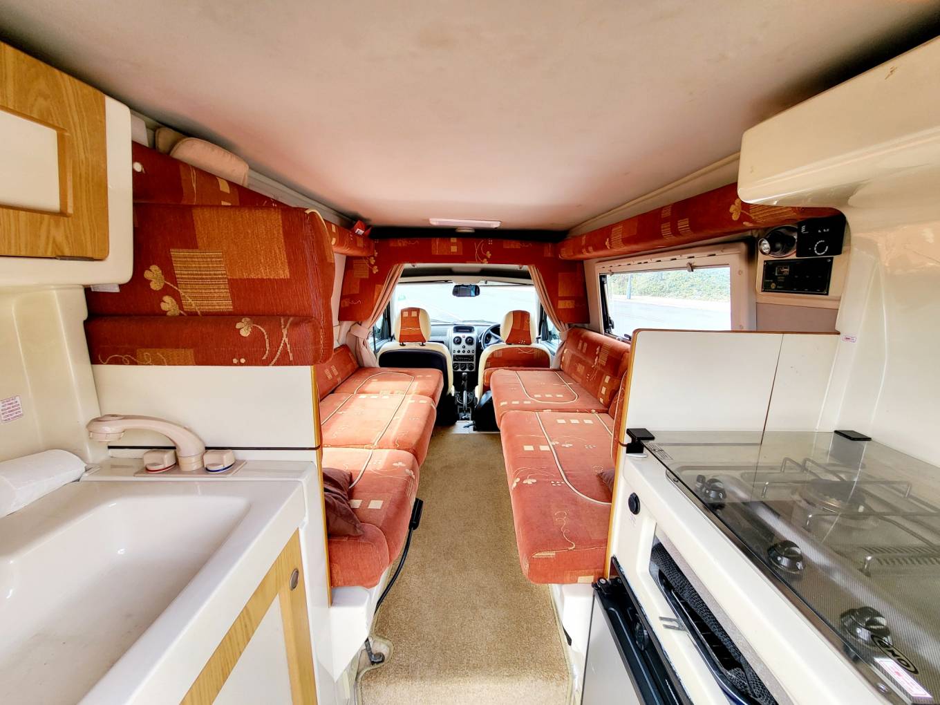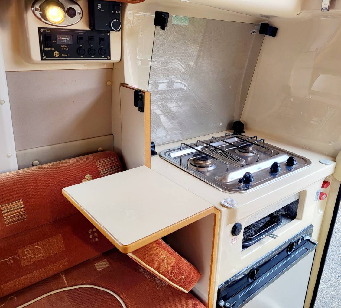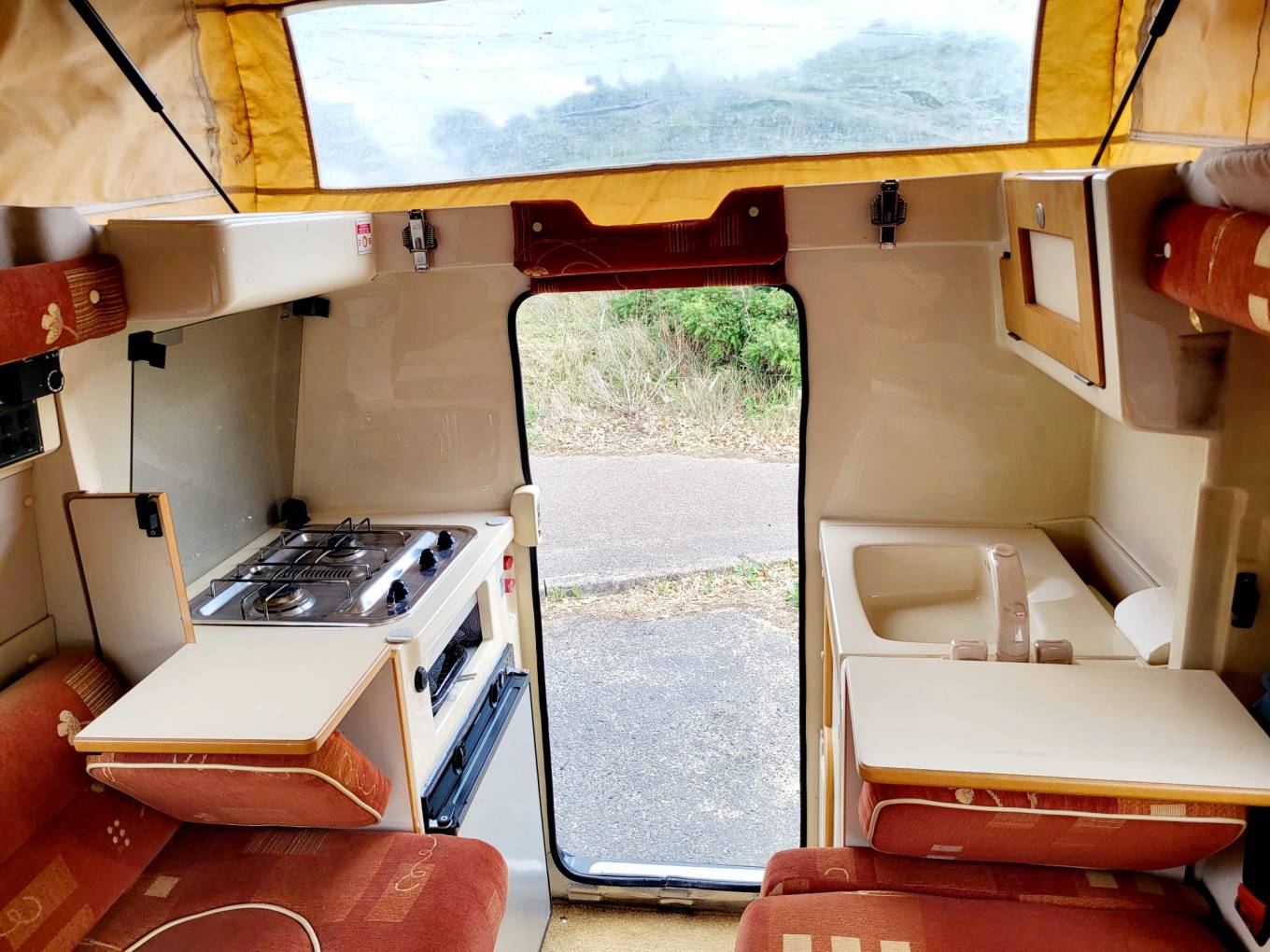 These campers have everything you need for comfortable weekend trips to the beach, with the side facing sofas making into a large double bed or 2 singles, a dining area, a small rear kitchen area with a sink, 2 burner hob, grill and fridge and it even has diesel heating.