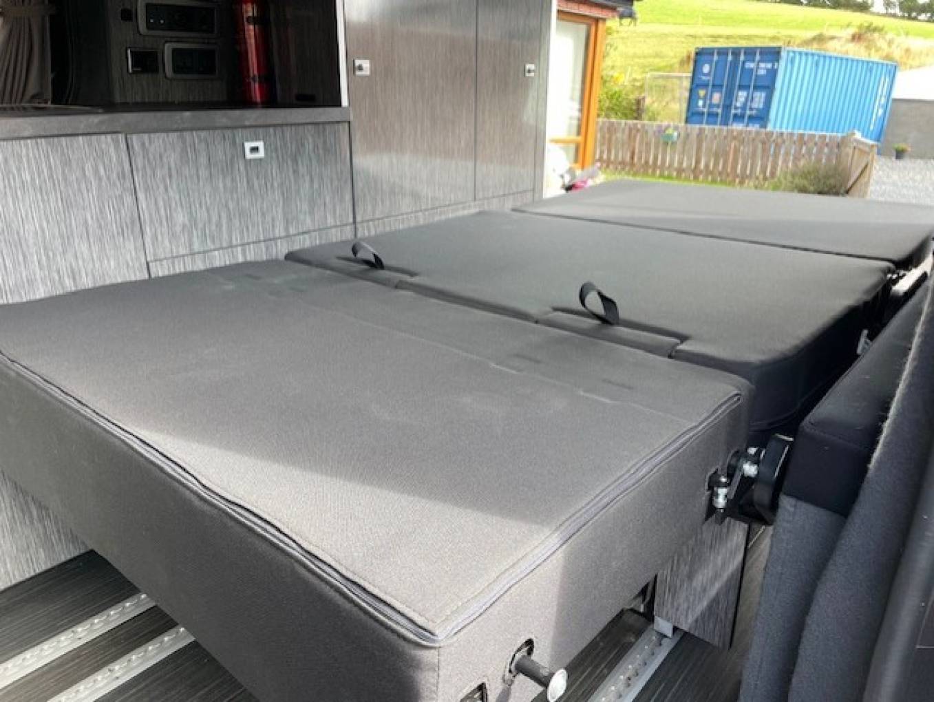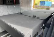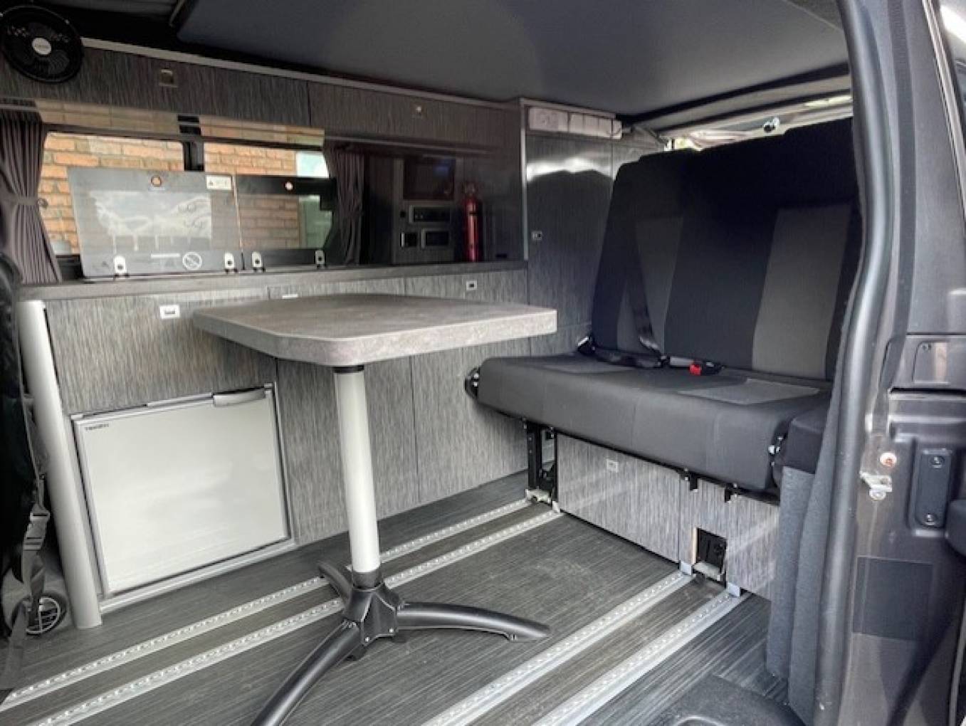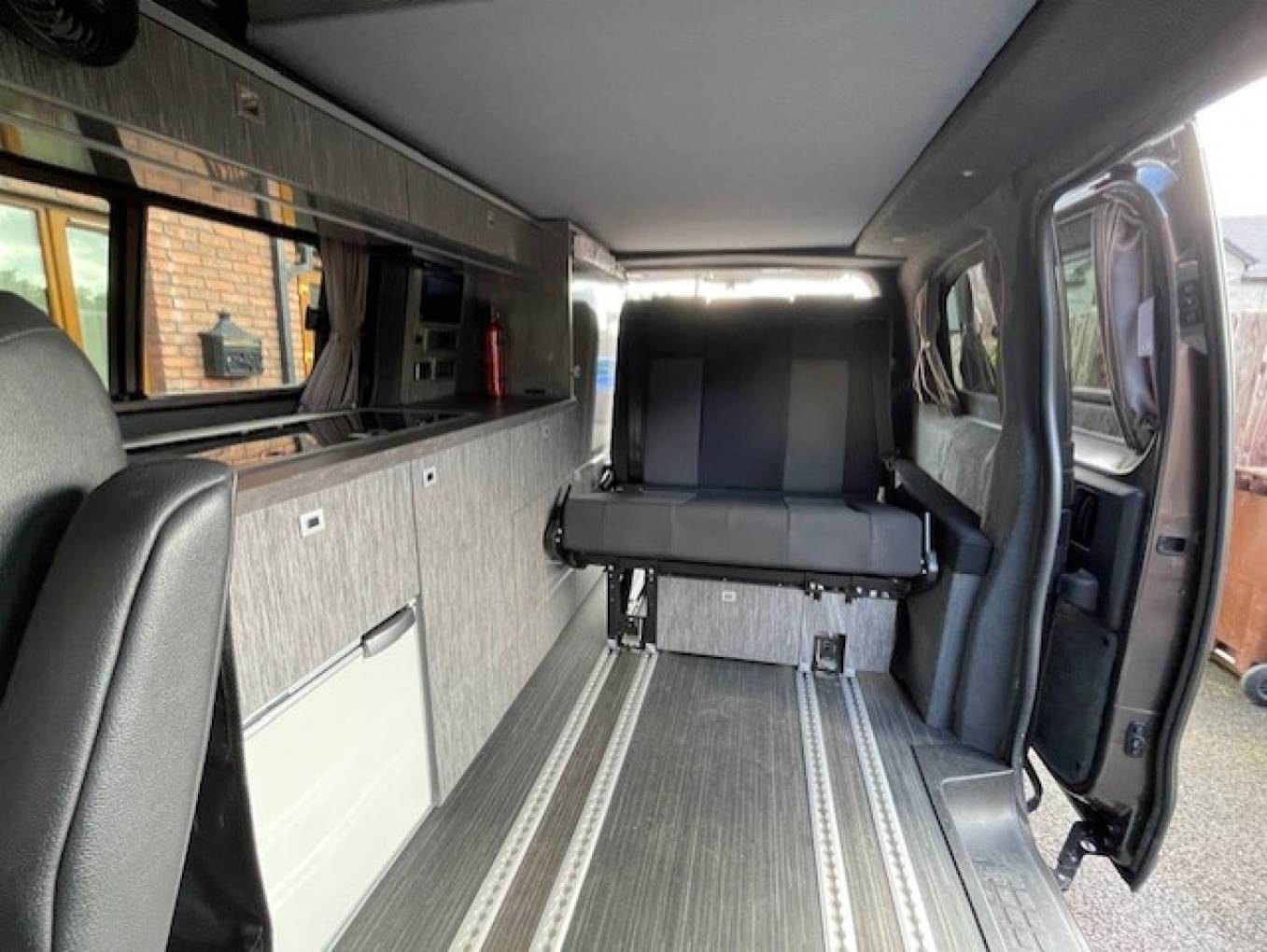 The rear seats have 2 fitted travelling seat belts. 2 rails have been fitted to allow this area to slide forward creating storage space.