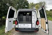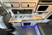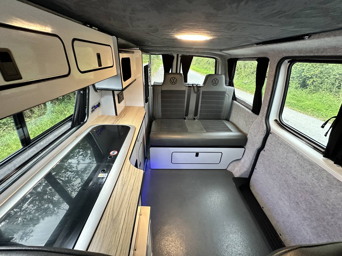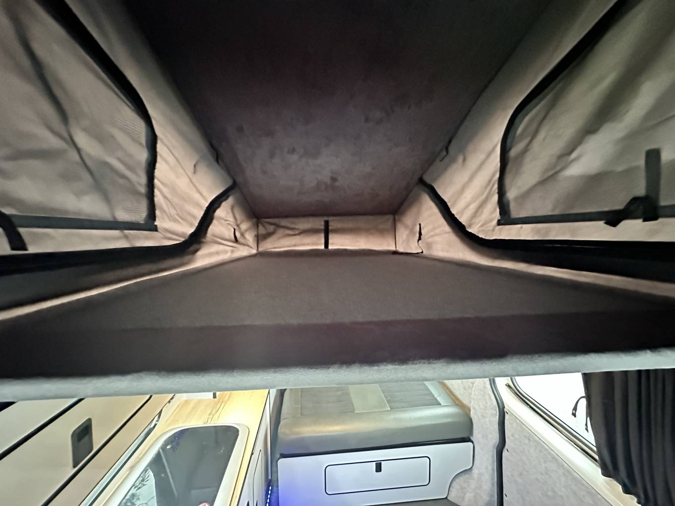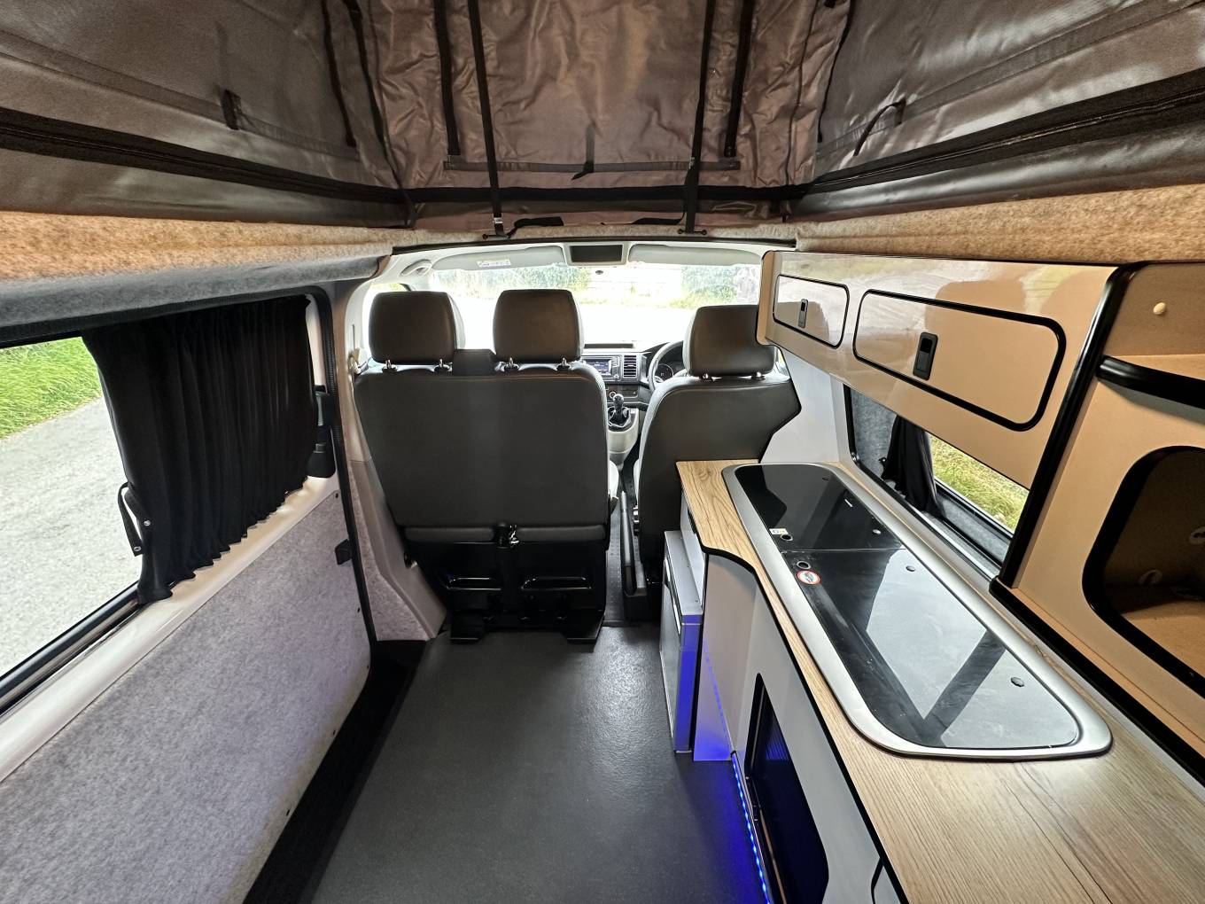 Entering through the side door we are greeted by white gloss units with a natural wooden top which keeps the interior light and airy. There is an abundance of storage along with a double burner hob and sink, Bekule Fridge and the control panel for the heating and lighting etc. The rock and roll bed features two additional 3 point seatbelts and also creates a comfortable small double bed. For Dining the front double passenger seat can swivel to allow four to sit around the foldable, removable table. There is a second sleeping area which is in the pop top roof and thi has a large front window along with two side openings with fly screens.