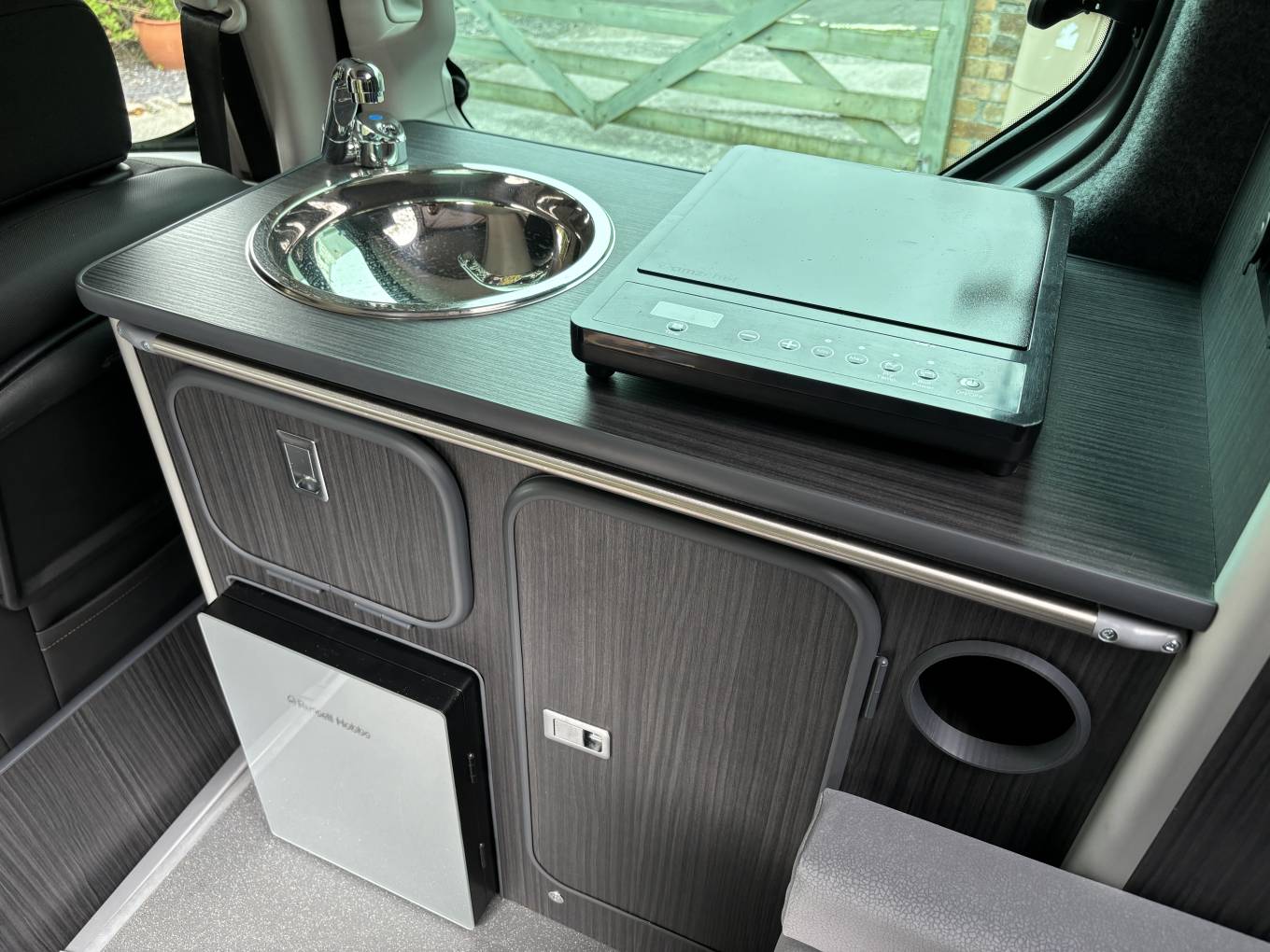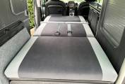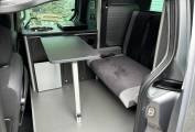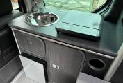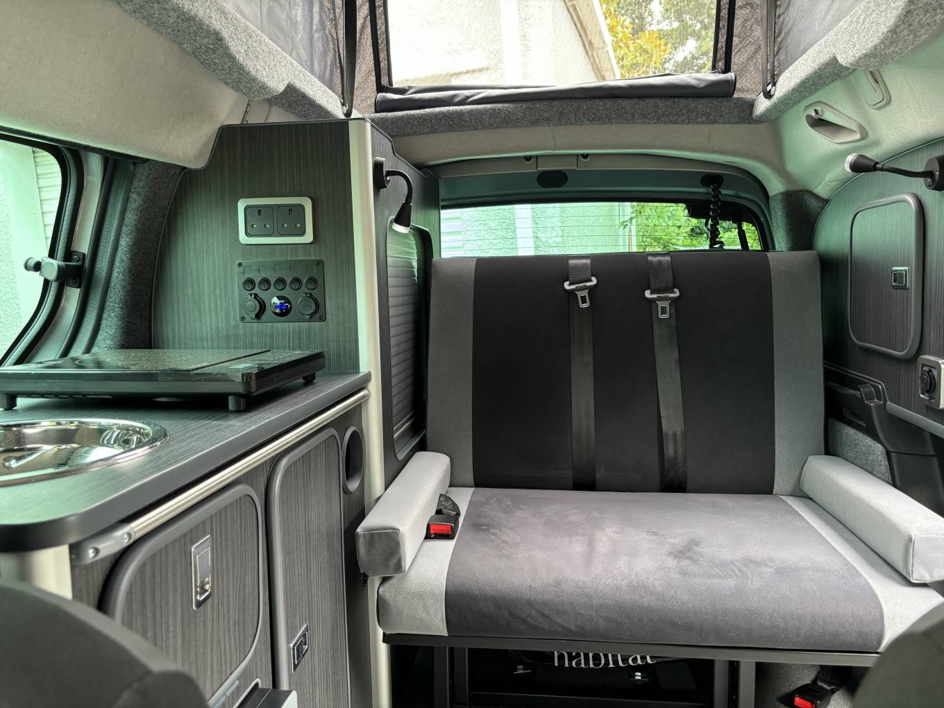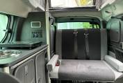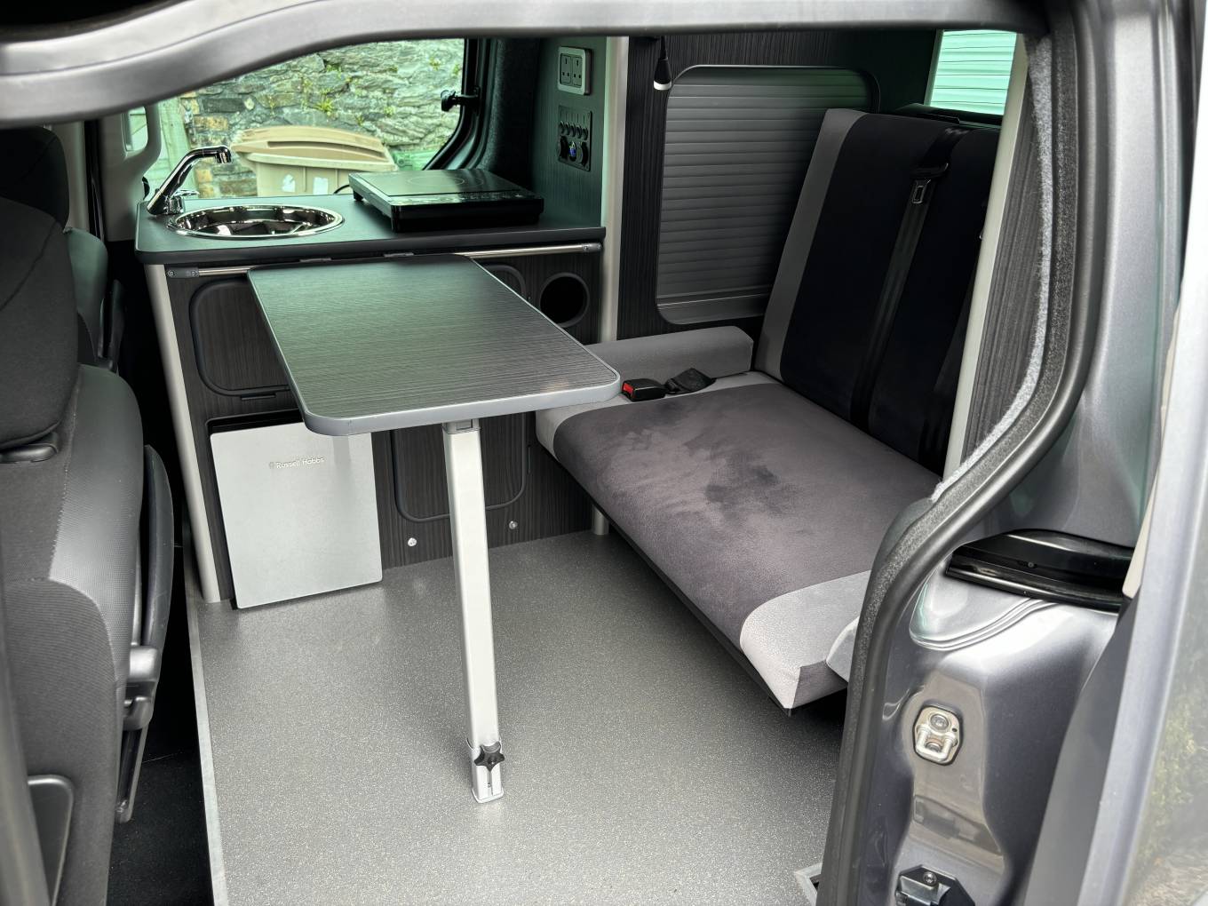 In the back we have a 2 berth rock n roll bed and a sink, electric hob and mini cooler to cover your camping needs. There is also a fold away table to create a nice dinette area which is enhanced by the swivel seat on the passenger side in the front and also a pop top to create lots more headroom.