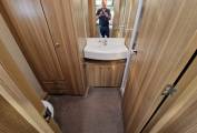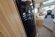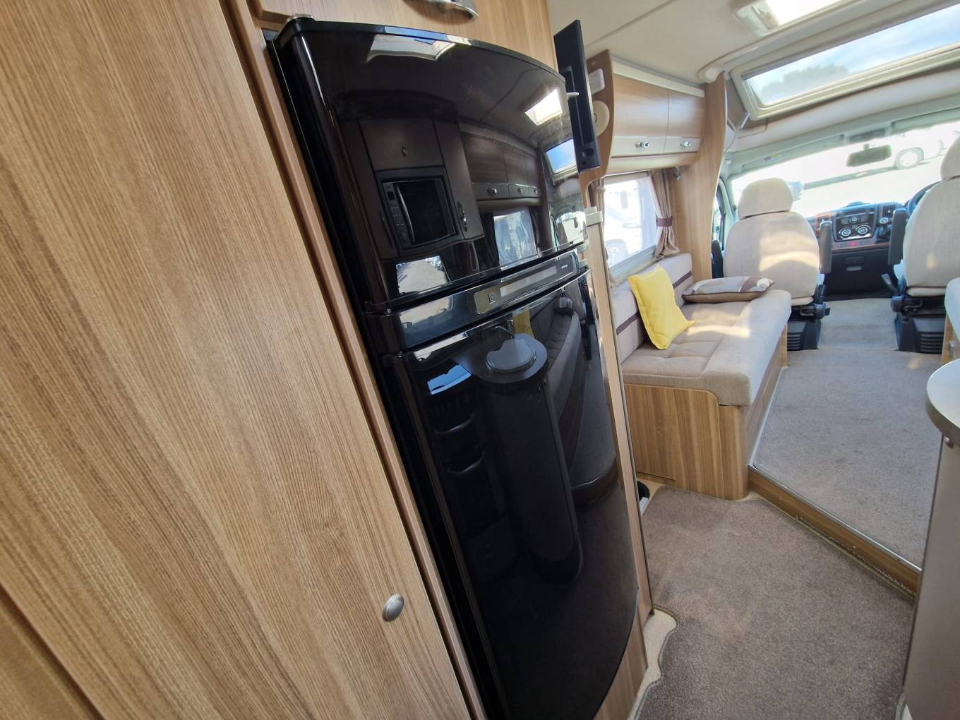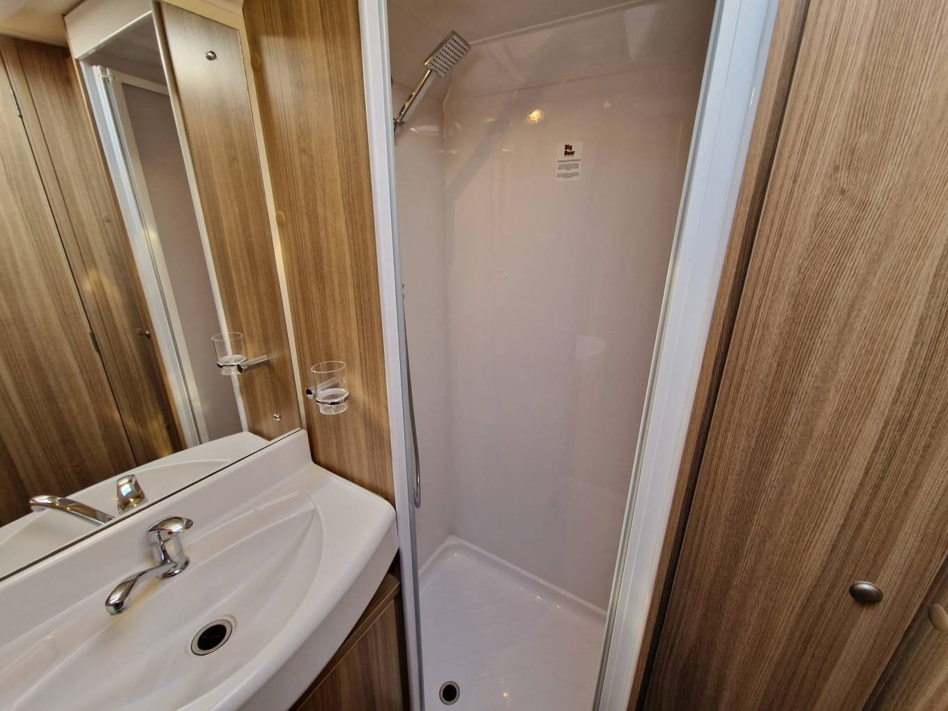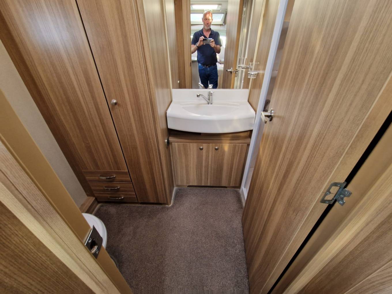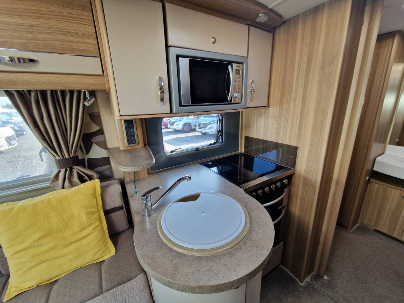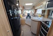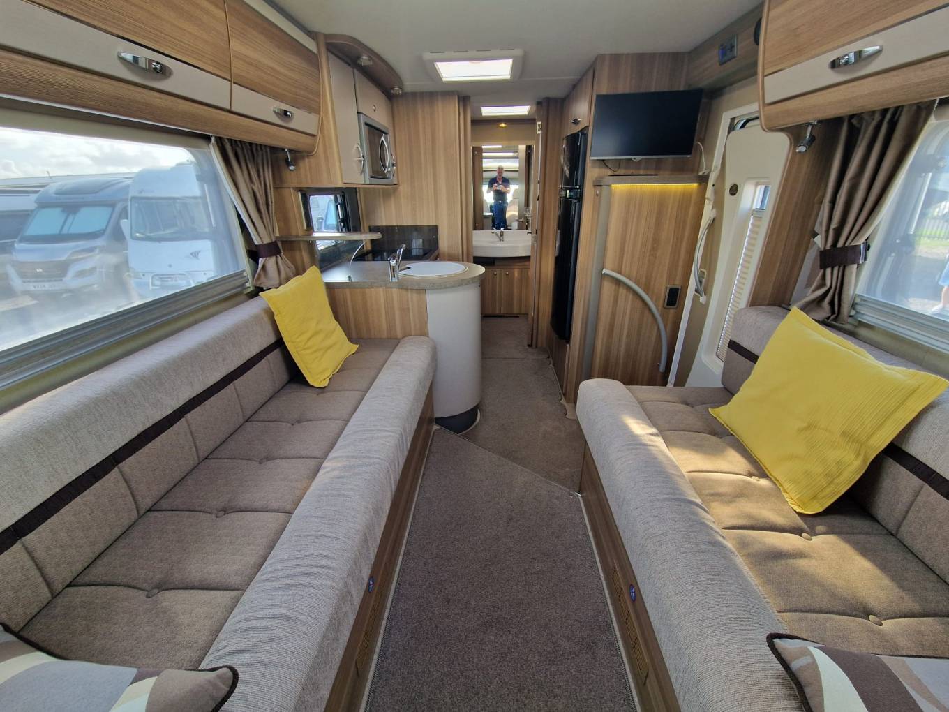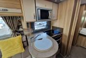 The Bessacarr E540 is perfect for a couple who want a bit more space and luxury than the average 2-berth and one of the outstanding features of this van is the full-width rear bathroom which is as good as any you will see in a motorhome. Entering via the habitation door on the passenger side, this bathroom is situated at the rear and comprises of WC, washbasin, separate shower space and added storage for toiletries and towels. The space in the bathroom is exceptional and gives loads of room for washing and changing and there is a door which closes this area off from the rest of the motorhome which allows it to be used as a private dressing room. Moving forward to the kitchen area which is equipped with a full cooker with dual fuel hob offering 1 electric burner and 3 gas burners, grill and oven, a built in microwave oven, and full-size 3 way fridge/freezer which is unused having just been replaced by the owner. Next is the spacious lounge which has two side facing sofas that can be quickly converted to a spacious double or two single beds as required.A folding dining table can be placed between the sofas, and the Captain seats swivel to form a nice bright social area with plenty of seats for family and friends and there is an Avtex TV with DVD player.There is plenty of storage below each sofa for additional items like your bedding etc.