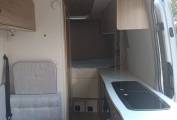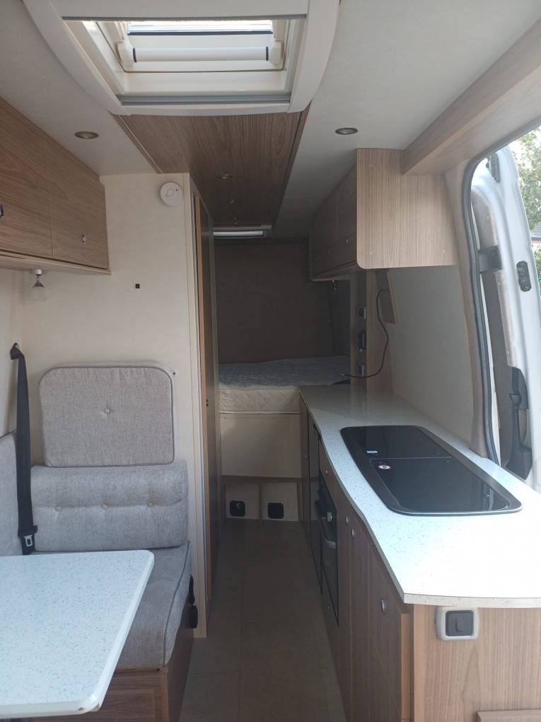 This Mercedes Sprinter 313 has been converted to a very good and modern standard. Upon entering the vehicle you have the centre dinette with two fixed seats with travelling seatbelts and removable dining table. By evening this area converts to make single bunk bed.