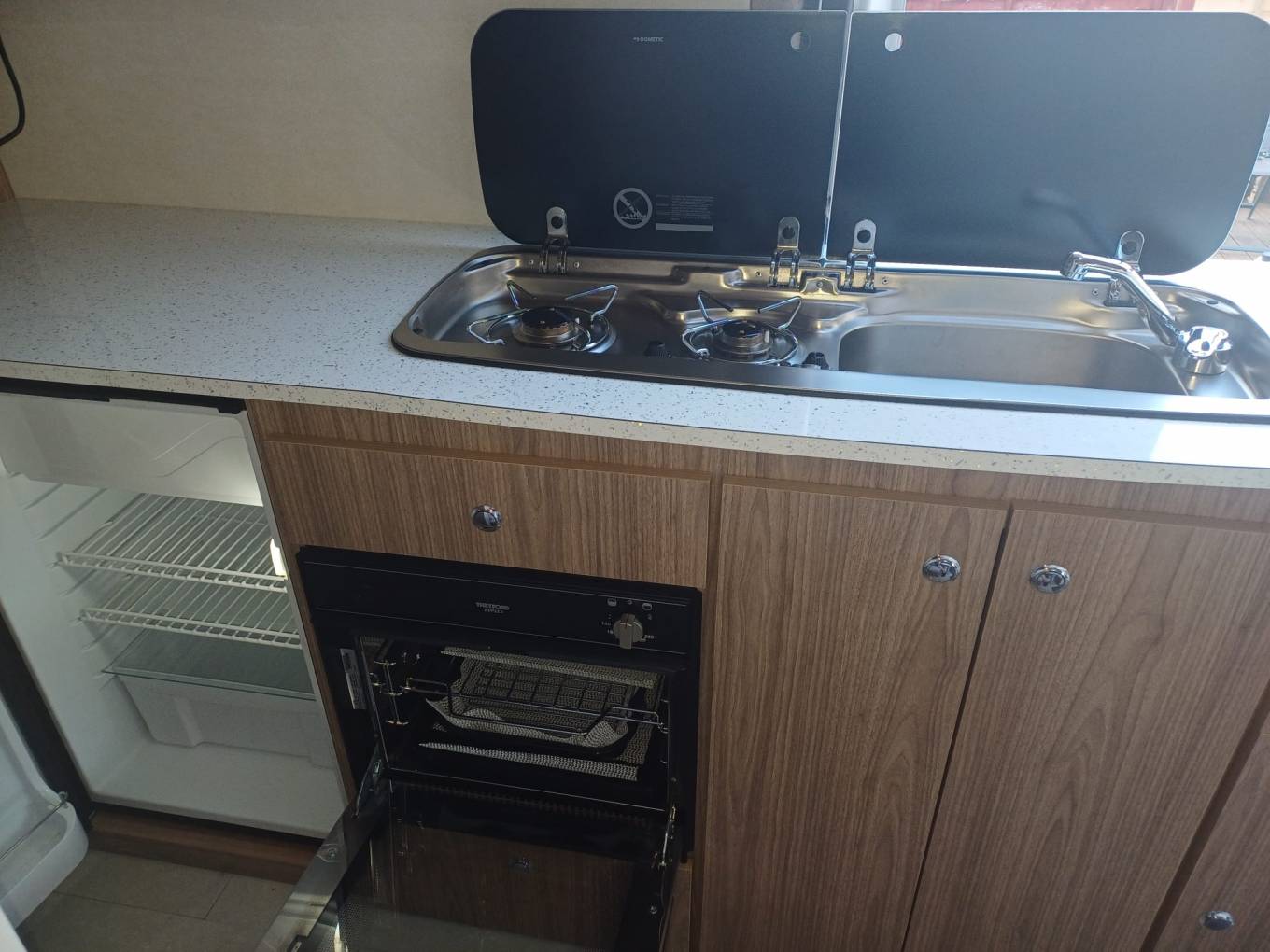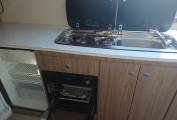 Moving along the centre of the vehicle you have the equipped kitchen with 2 gas ring hob, combined oven and grill, 12v fridge with small freezer compartment, storage above and below, opposite the kitchen you have the combined washroom with toilet, sink and shower.