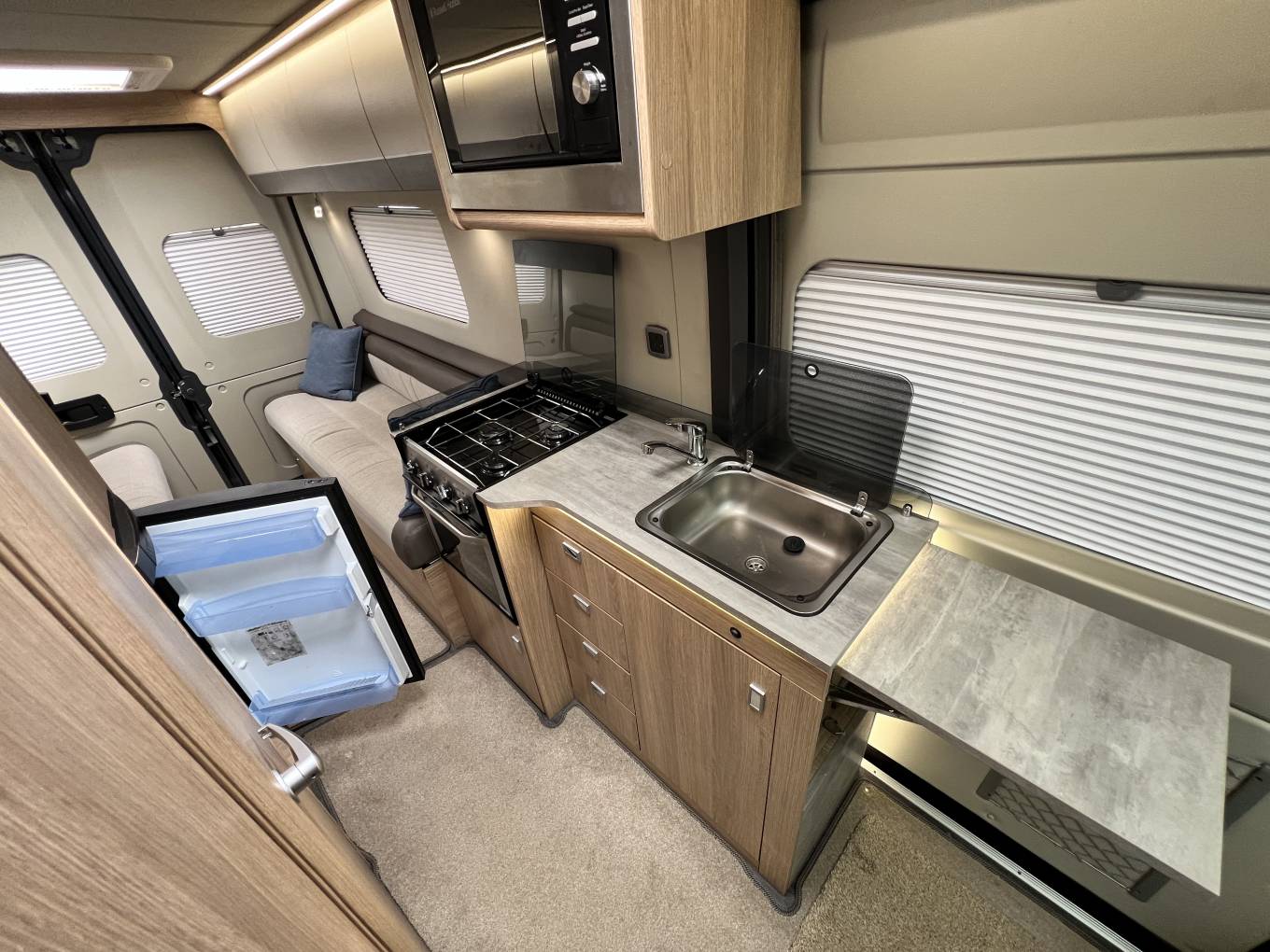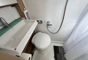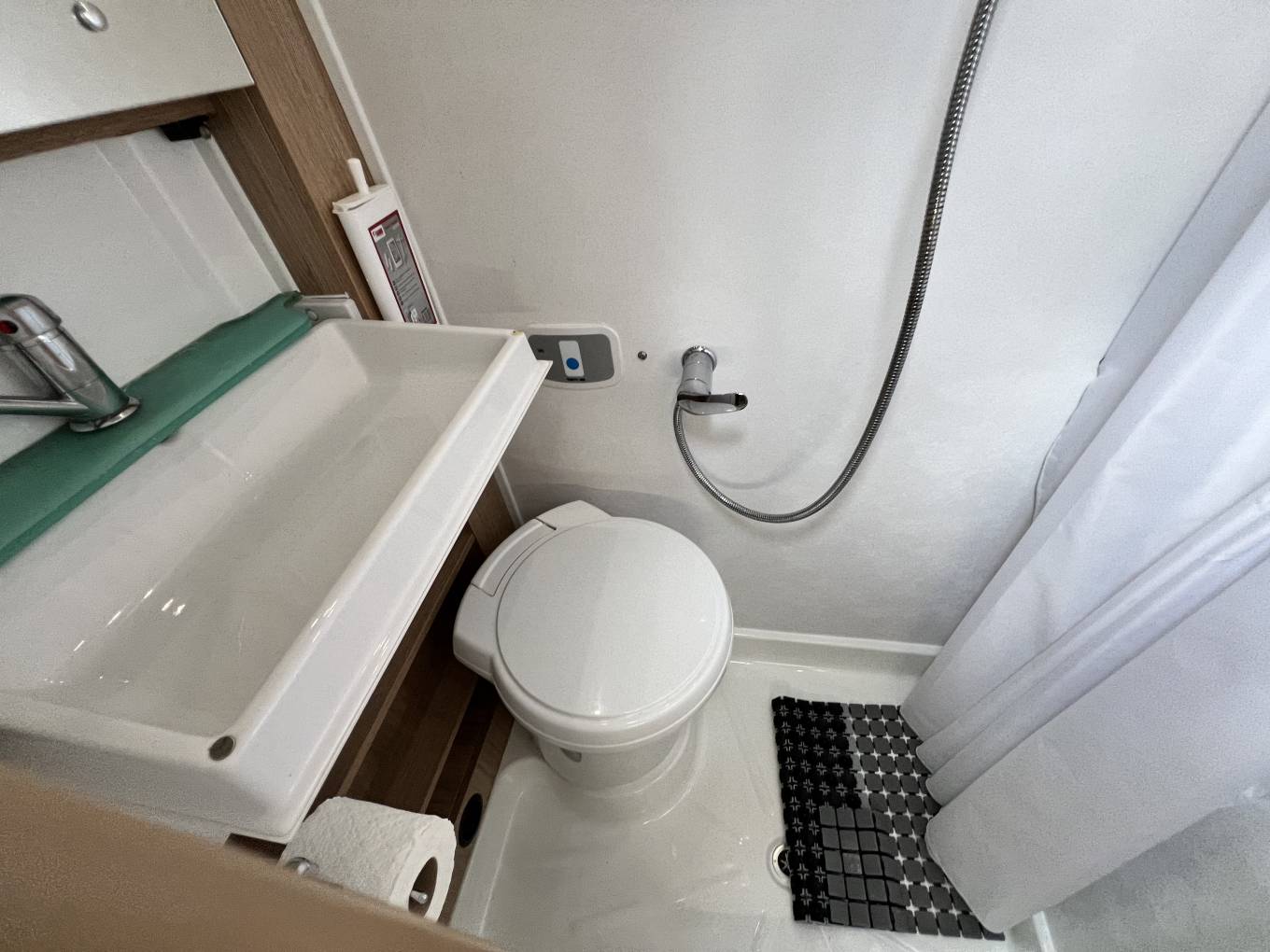 Opposite the kitchen is the Wetroom style bathroom consisting of a Thetford Flush Cassette Toilet, a Foldaway Wash-hand Basin and a Shower.
