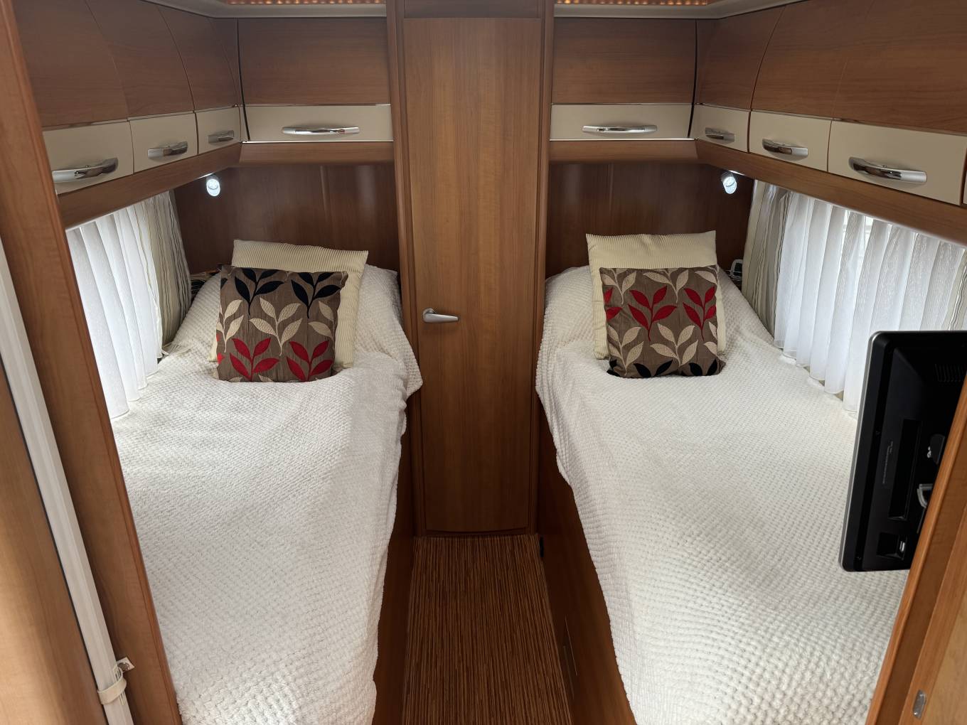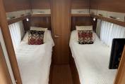 As we start to move through the motorhome, it features twin single beds in the rear, providing a comfortable and restful night's sleep. The beds are easily accessible and come with ample storage underneath and overhead.