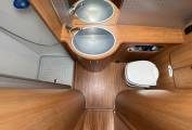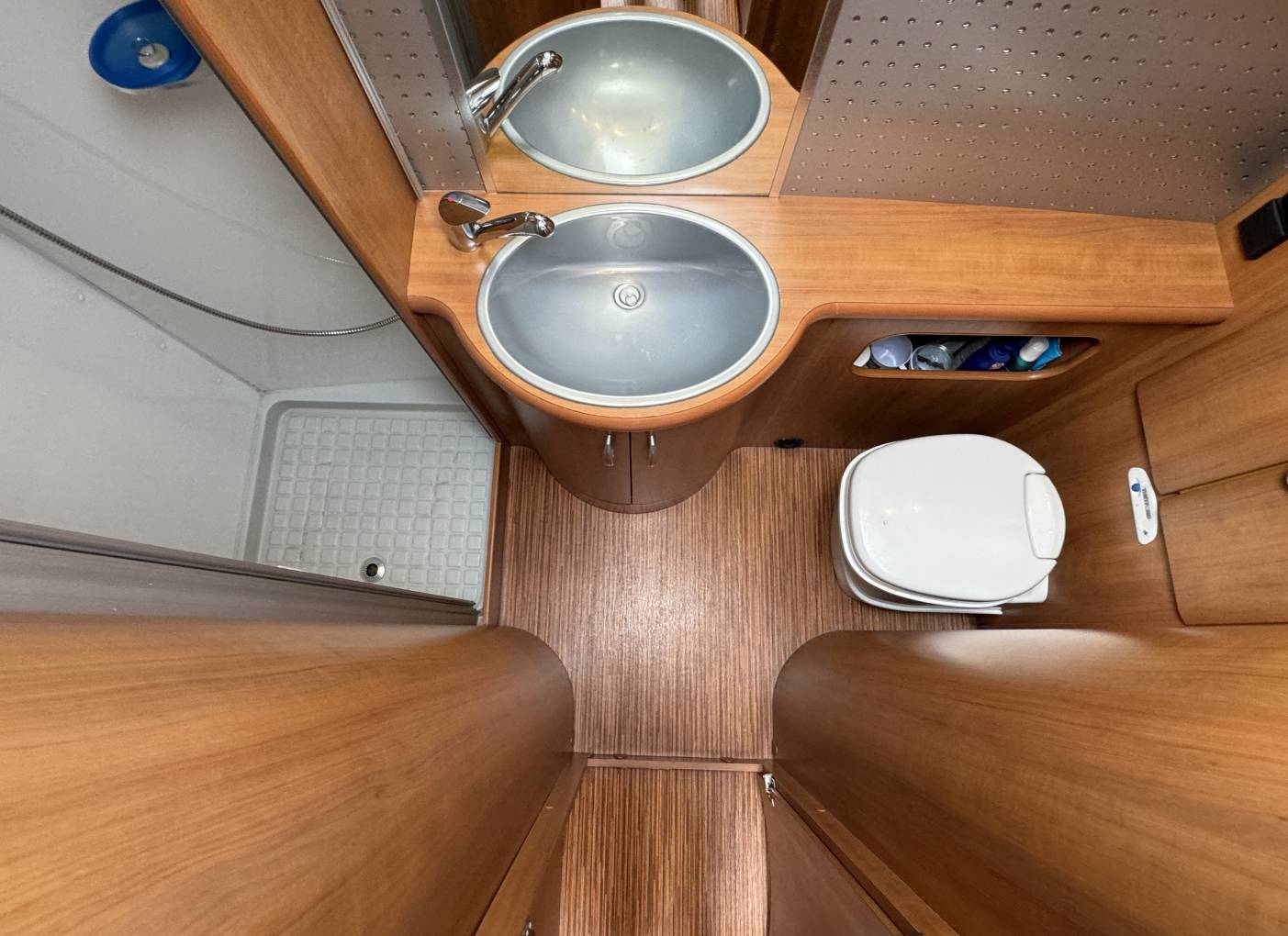 Starting with the rear of the motorhome, there is the large washroom includes a separate shower cubicle, a toilet, and a stylish vanity unit. It’s designed for comfort and convenience, ensuring you can freshen up wherever your travels take you.