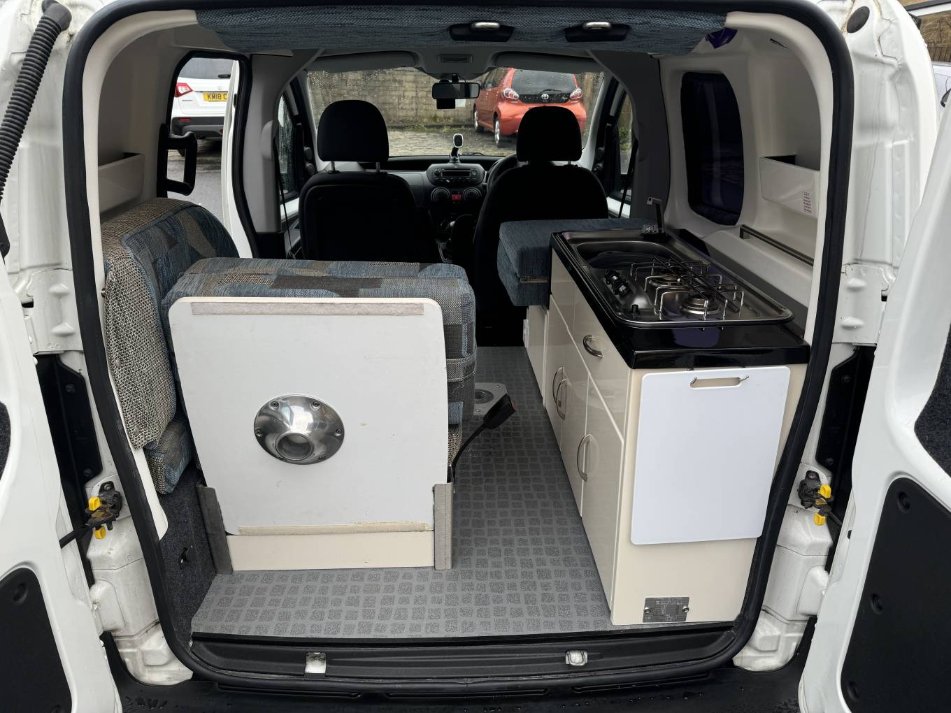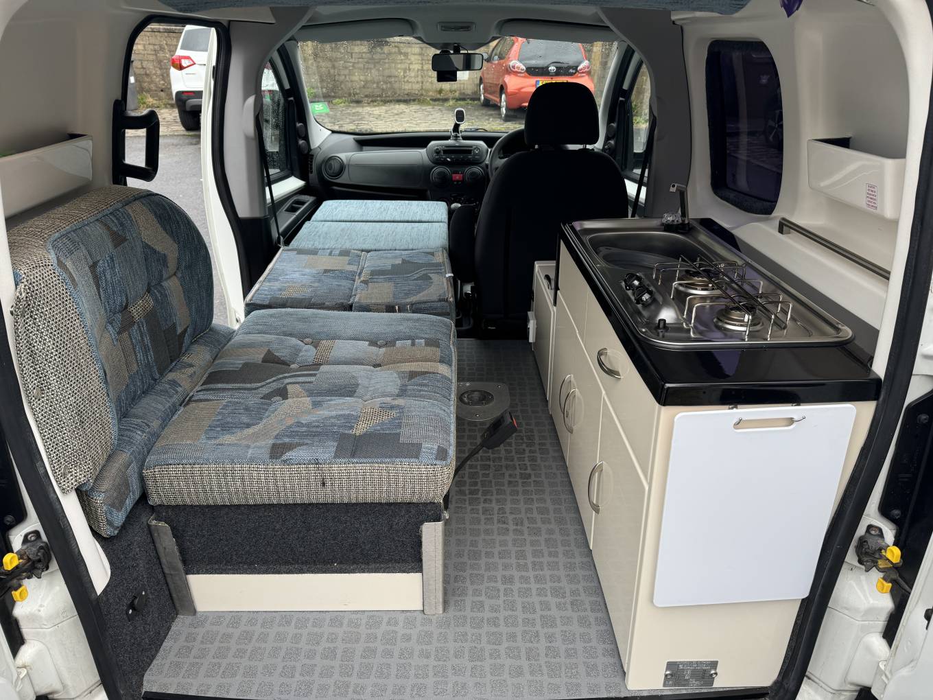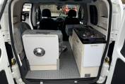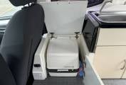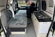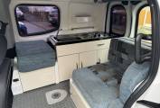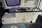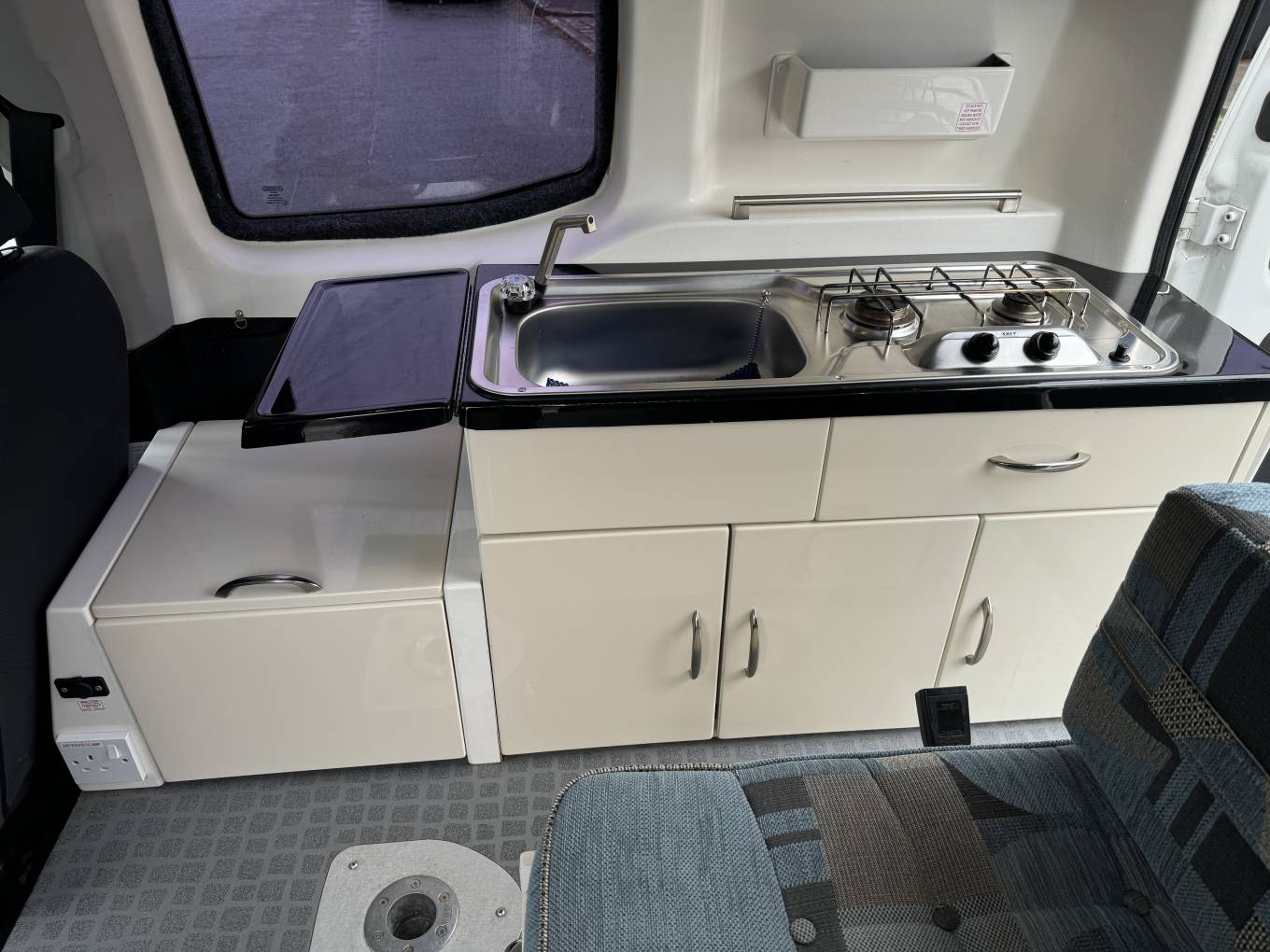 The motorhome features a well-thought-out kitchenette, complete with a gas hob and sink, allowing you to prepare meals on the go. There’s also a handy storage area for your kitchen essentials.