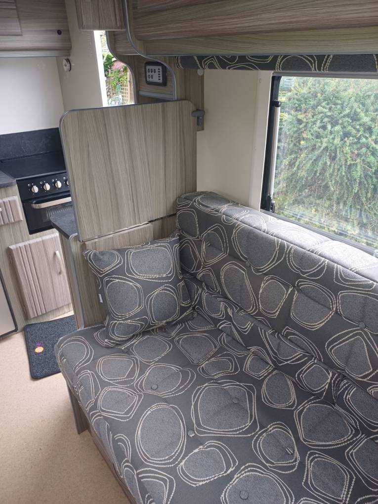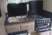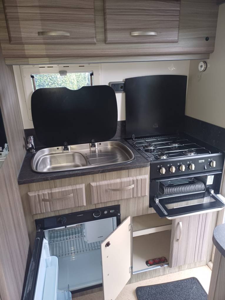 As you enter the habitation area through the rear you have the fully equipped end kitchen with 3 way fridge and small freezer compartment, 4 ring hob, combined oven and grill, sink with drainer and plenty of storage. You also have the combined washroom with toilet, shower and sink.