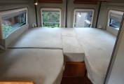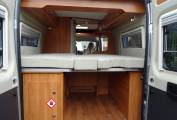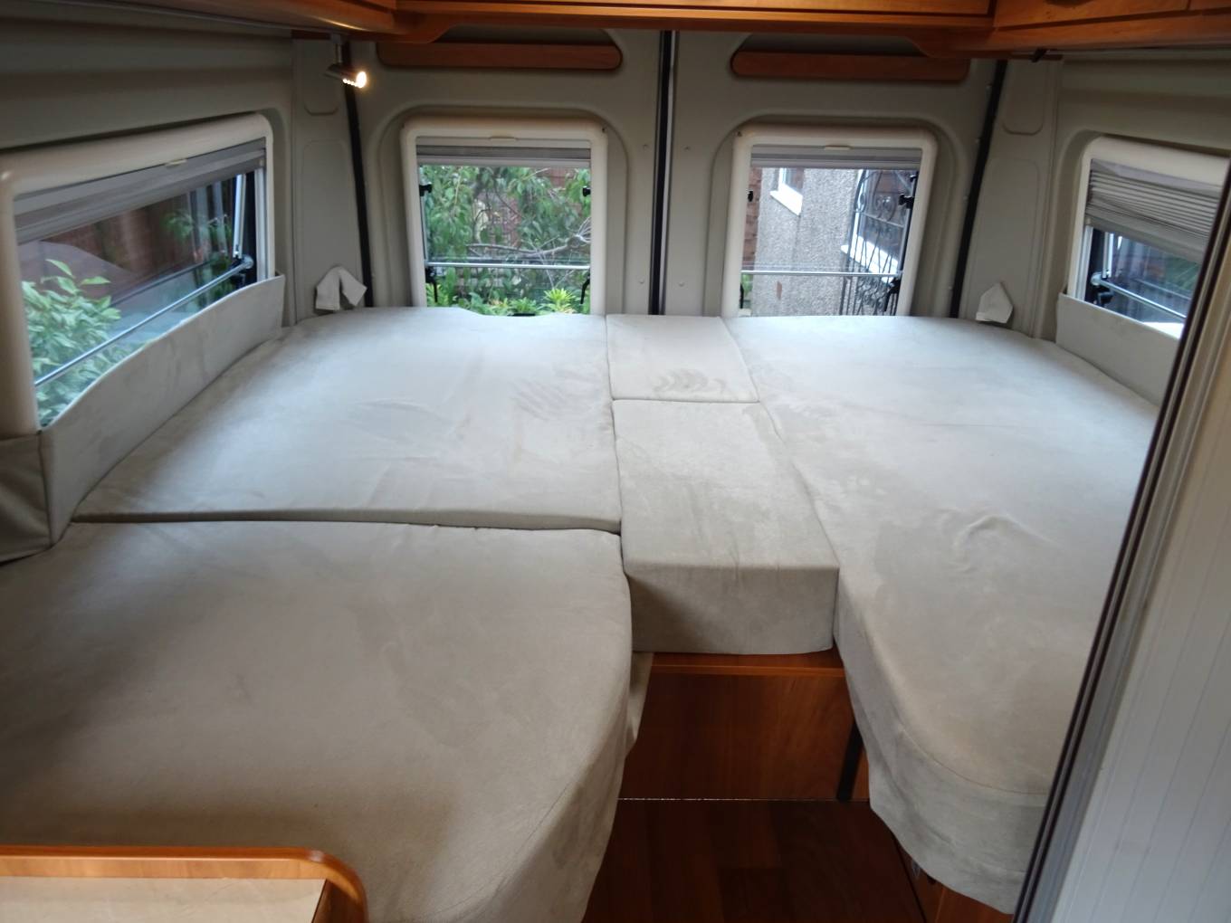 This German factory conversion features many of the comforts of a coach built Motorhome and has twin singles or a large double bed over a large storage area, a central washroom with it's cleverly designed separate shower & wrap around shower door, toilet, wash basin, toiletries cupboard, and good size vanity mirror, kitchen area consisting of 2-burner gas hob, fridge freezer, sink and plentiful worktop, Duel Fuel Heating and hot water, fresh and grey water storage tanks front lounge area with twin swivel chairs and 4 belted travel seats, cruise control, cab A/C and wind out awning.