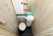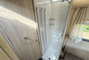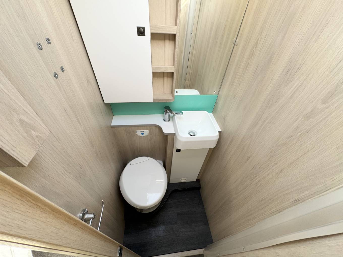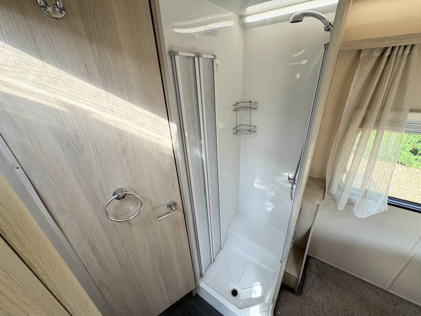 The lounge area has two cozy bench seats, with an electric drop-down bed above for added convenience. The washroom provides an en suite feel, as closing the bathroom door to the living area creates a private space with a large separate shower and toilet cassette.