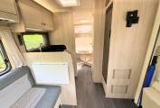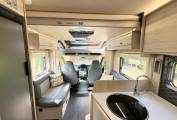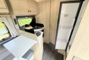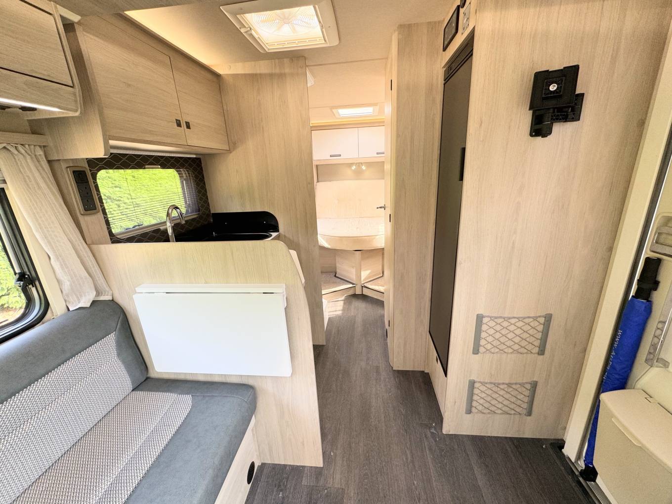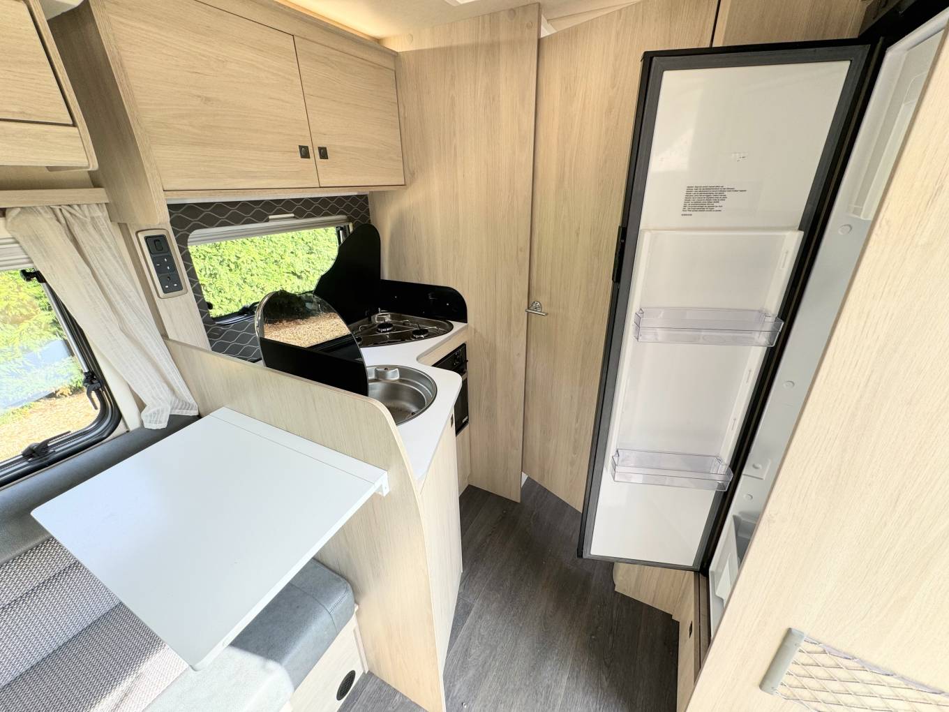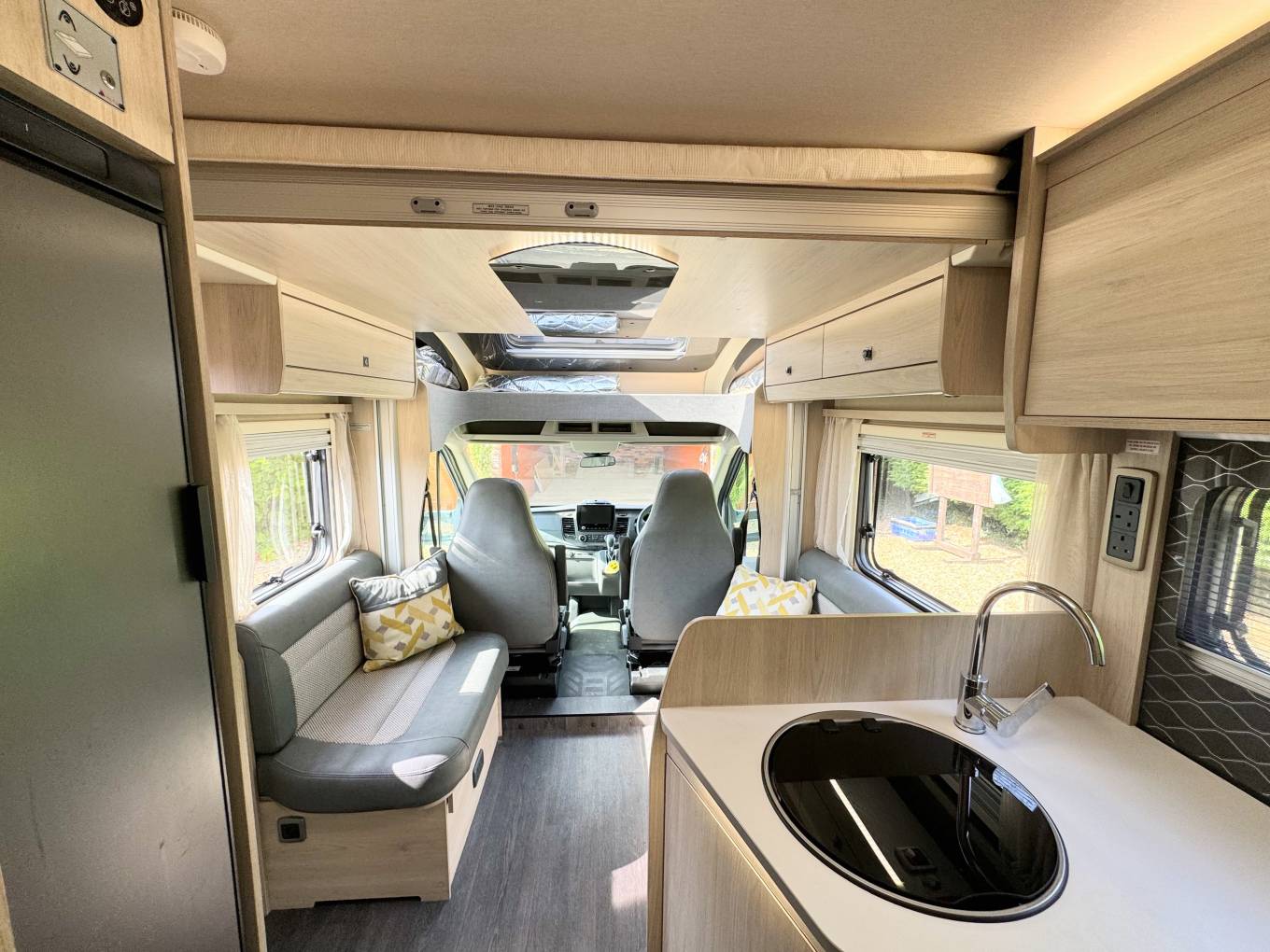 The interior offers a well-equipped kitchen, featuring a Thetford duplex oven/grill, a three-burner gas hob, a generous fridge with a freezer compartment, and a sink with a mixer tap. There’s plenty of storage space to keep everything organised during your travels.