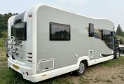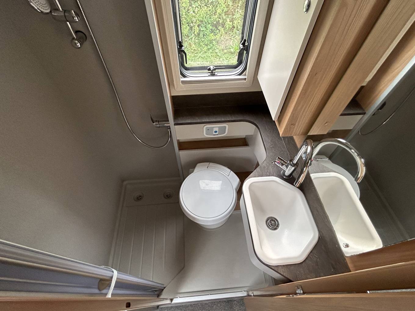 There is a centrally located washroom with Thetford flush cassette toilet, sink, cabinet and separate shower. Hot water and heating is provided by the excellent Alde Wet system. Externally the motorhome comes with large wind out awning, small rear garage, bike rack, gas point and a solar panel.