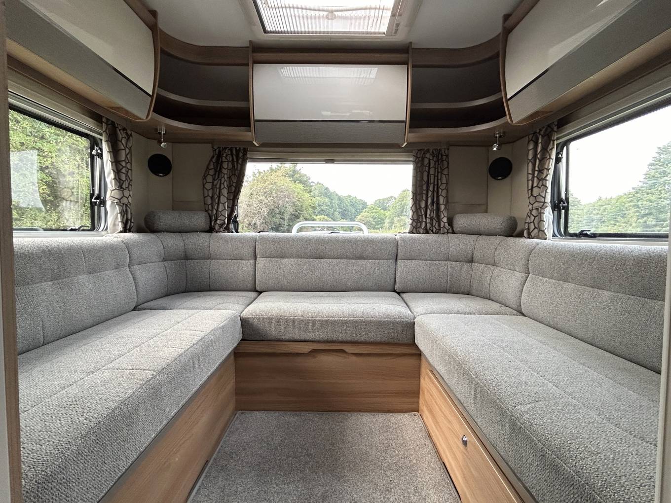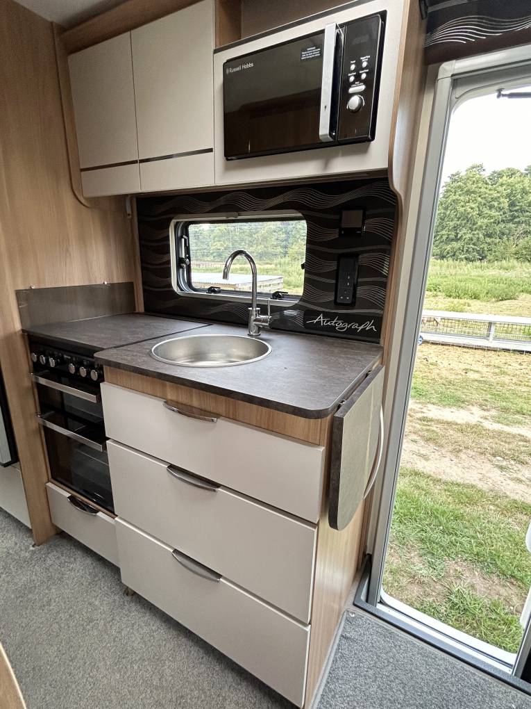The motorhome is built on the renowned Peugeot Boxer chassis and has an economical but powerful 2.2 litre 165 bhp engine with a 6 speed manual gearbox. It comes with cab air conditioning, cruise control, DAB radio and reversing camera making it an absolute pleasure to drive. The Bailey Autograph 81-6 has a wonderful spacious living area and is extremely stylish and luxurious. Starting at the rear you have the ever desirable U-shaped lounge area which is perfect to put your feet up and relax after a day out. The sofas pull together to make a kingsize bed or alternatively they can be used as 2 single beds measuring 82 x 73 inches.
