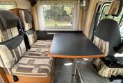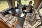 Behind the cab is the spacious lounge dinette. Here you have a forward facing 2 seater sofa with 2 seat belts and a side facing 2 seater sofa. Once the 2 front seats have been swivelled around up to 6 people can sit round the dining table to enjoy meals, drinks or to play games. The dining table can be removed and stored away if you require more space. With 5G Wi-Fi onboard even the kids will have plenty to keep them occupied. At bedtime this area converts into a double bed.