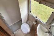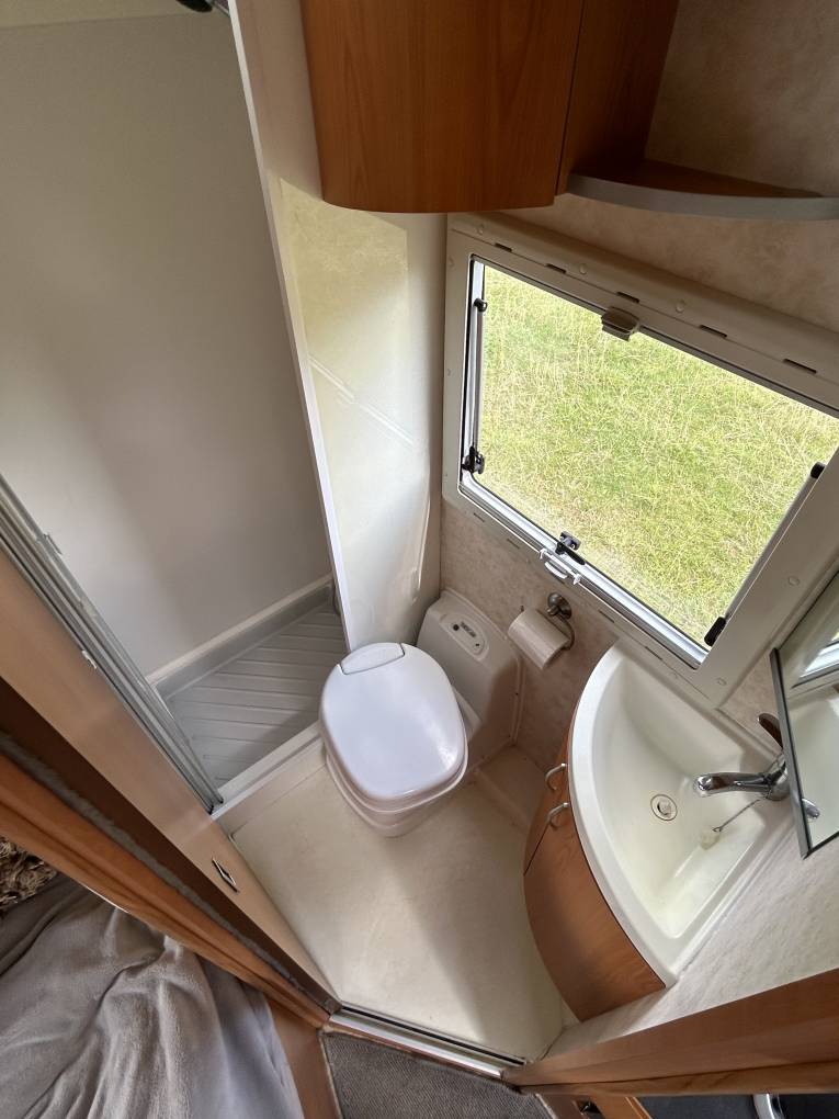Next to the rear bed is the washroom which has a separate shower, a Thetford cassette toilet, a wash basin and mixer tap, a bathroom cabinet to store your toiletries and a large window which floods the washroom with natural light.
