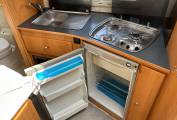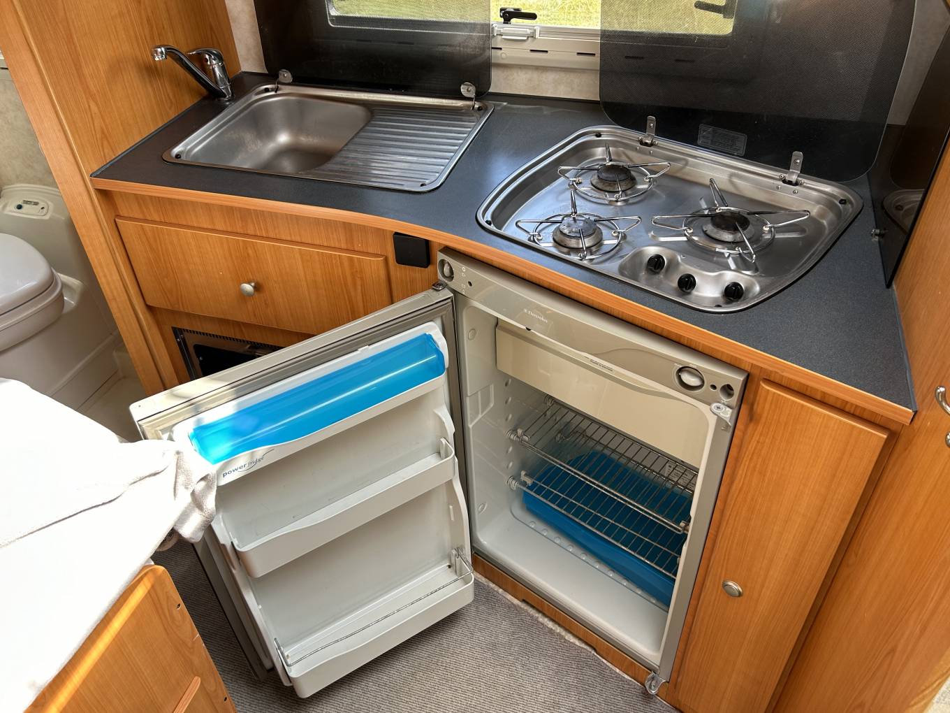 The mid-kitchen is well equipped so you should have no problems rustling up great food on the go. There is a 3 gas burner hob, a grill, a three way fridge with ice box and a stainless steel sink with a mixer tap. You also have a generous amount of cupboard and drawer space for cookware and crockery.