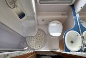Opposite is the bathroom and here you have a separate shower with its own screen door, a Thetford cassette toilet, a wash basin and mixer tap, a mirror and a bathroom cabinet for your toiletries. A large window allows plenty of daylight in.