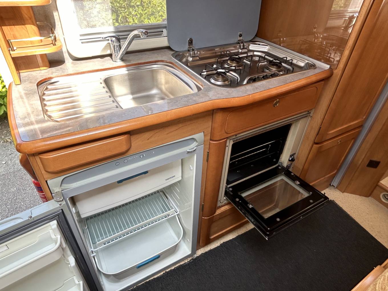 The mid-kitchen has a gas oven and grill, a 3 gas burner hob, a stainless steel sink and mixer tap and a three way fridge with a freezer box.