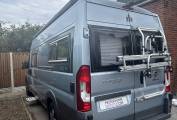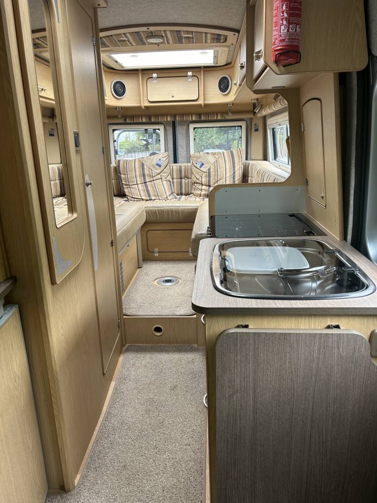 The rear U-shaped lounge, surrounded by large windows, offers panoramic views and can easily be converted into a spacious double bed. A 12V Aztec TV is stored in a discreet unit and is perfectly positioned for viewing from the lounge. The rear doors give you access to storage underneath the seats, The motorhome is heated by a Truma system, ensuring comfort in all seasons. A 100w solar panel supports off-grid power, and there’s ample storage space at the rear.