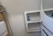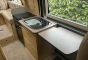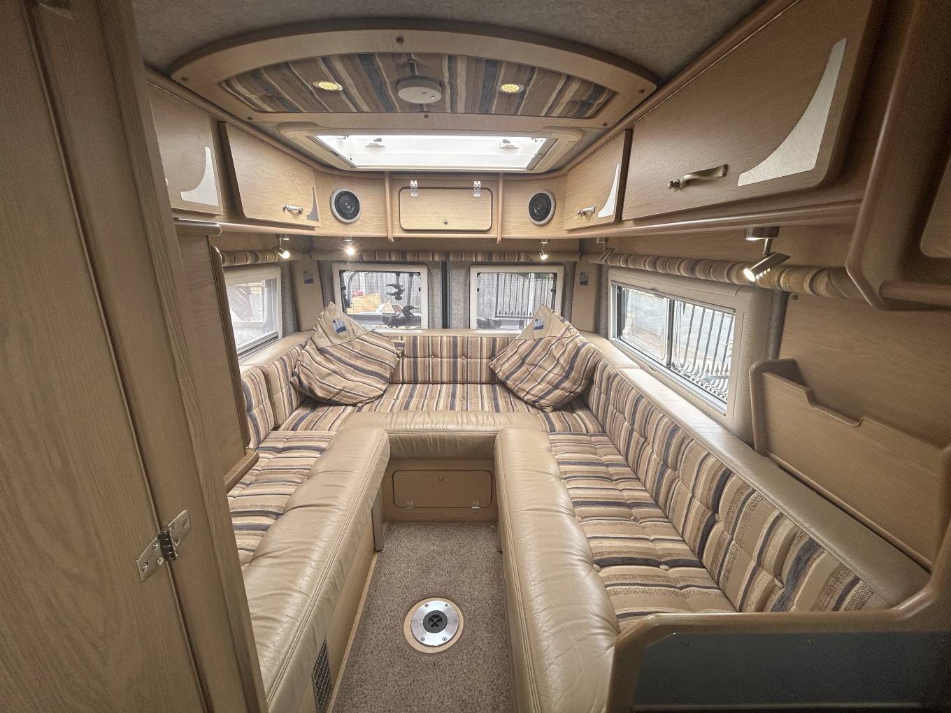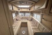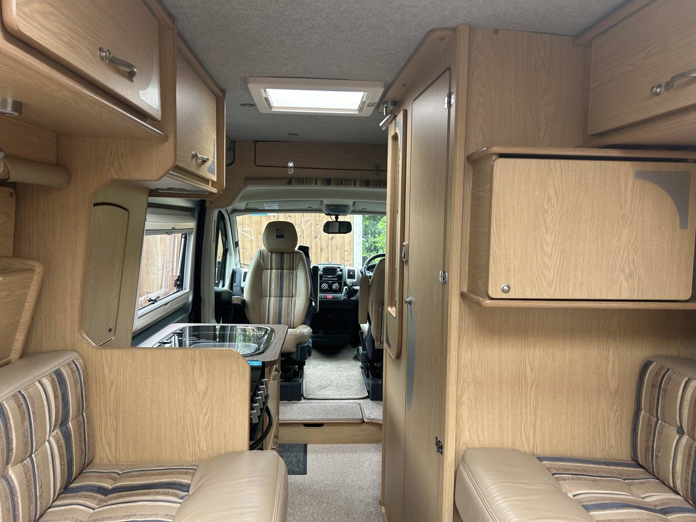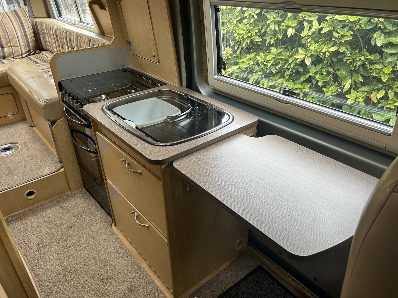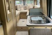 Inside, the 630RL provides plenty of storage with a wardrobe and various cupboards. The kitchen is well-equipped, featuring a full oven and grill, 3x gas hobs, 1electric hob, a sink with a mixer tap, and a 3way fridge-freezer that operates on12V, 240V and gasr. An on-board Gaslow tank ensures a reliable gas supply. The washroom is compact yet functional, with a pull-down sink, a mixer tap, a shower, and a storage unit.