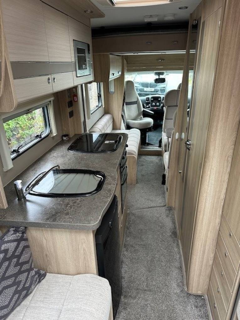 The kitchen is practical and fully equipped with a Dometic fridge freezer, 3 gas burner and 1 hotplate hob, gas oven, microwave, stainless sink, and generous storage both high and low.