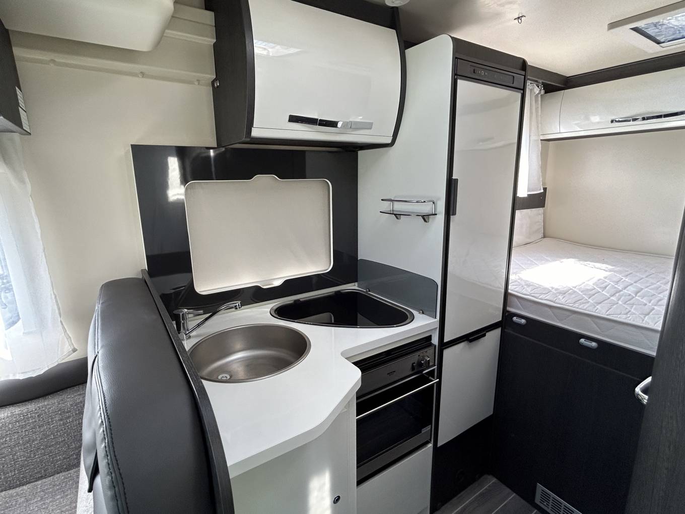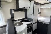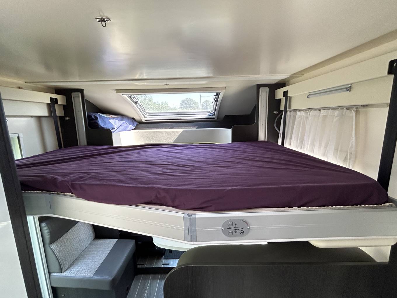 One of the standout features of this lovely motorhome is the sleeping facilities. At the rear you have a transverse fixed bed which comes with a very comfortable mattress. This has the obvious advantage of not having to make a bed up each night and put it away again the following morning. There is plenty of storage space in the overhead lockers and a window and a skylight flood the bedroom with plenty of light during the day. As well as this you also have an electric drop-down bed which in effect gives you another fixed bed that doesn't need to be made up and doesn't take up any of your valuable floor space.