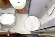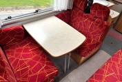 This layout is one of Hymer's most popular as it incorporates the front seats to create an enormous lounge area yet it is just over 6 metres in length. The seat covers are removable with the original Hymer blue upholstery beneath.