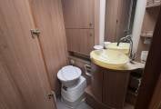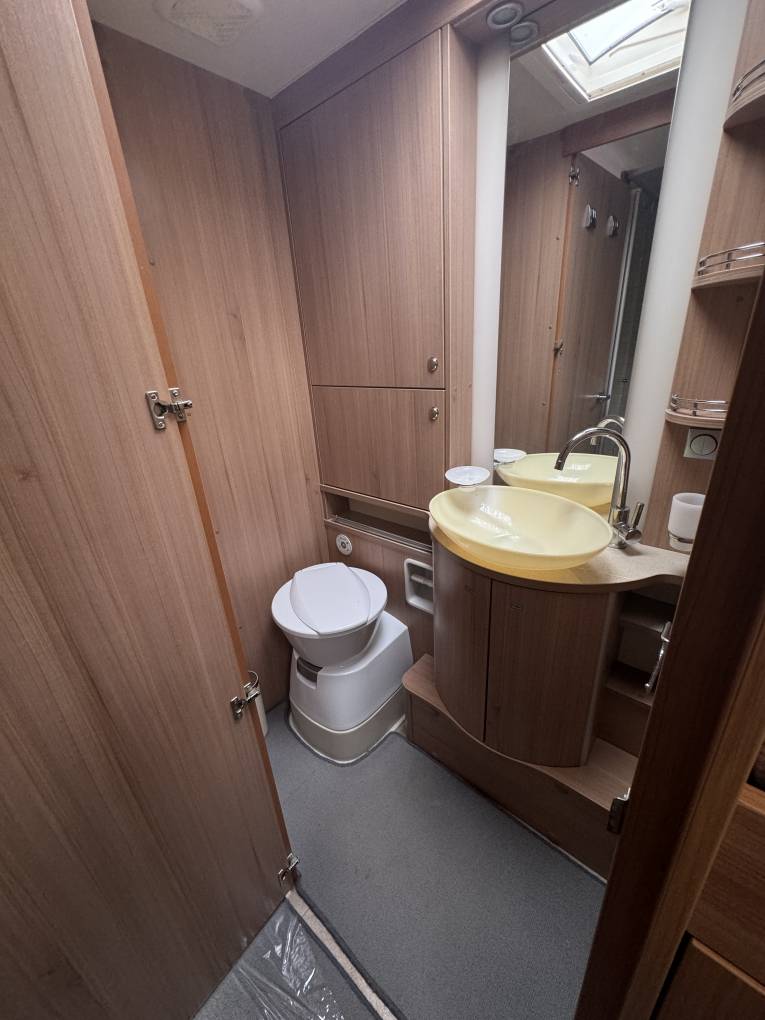 Between the bathroom and rear beds, we have the bathroom/changing area. one side has the wash basin and toilet, and opposite is the separate shower. In between is plenty of space to dry off and change, beneath the beds are drawers and a wardrobe for storage.