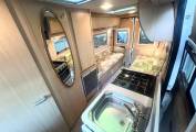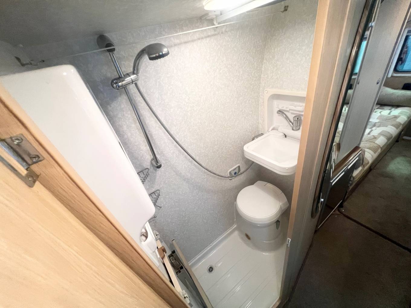 The layout is front lounge/rear offside galley kitchen. The kitchen is very tidy with lots of work top for meal preparation. There is a central sink with mixer tap, 3 gas burner, hob oven and grill. There is excellent storage in this area (and throughout the whole camper), and plenty of natural light and even more with the rear doors open. Nearside rear is the washroom with electric flush cassette toilet, integrated shower with curtain, drop down basin and vanity cabinet. Again all very tidy indeed. Next up is the large hanger wardrobe with dedicated folded table storage. The lounge area is comfortable.