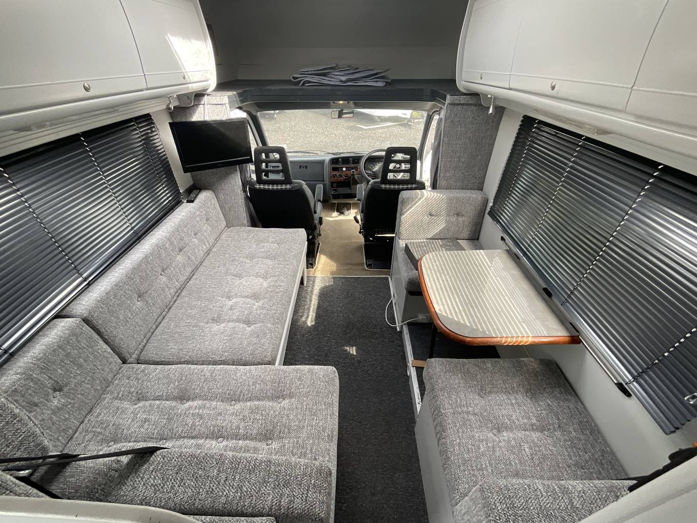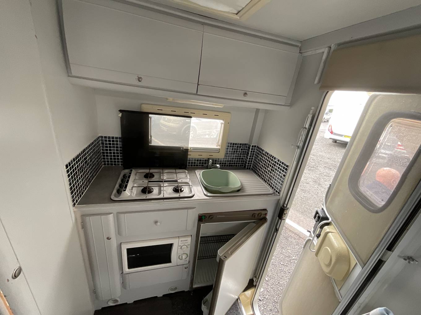 This motorhome is the perfect starter vehicle to dip your toe into the motorhome community and way of life. The exterior is in good conditon for a 26 year old vehicle. The engine has only covered 64.6k miles and was serviced in April this year at point of its MOT. The inside of the vehicle has been updated with a nuetral light grey paint and the upholstery recovered in a light grey fabric. There are three, 3-point forward facing seat belts in the rear, allowing to 5 people to travel. The twin dinettes convert into a double and a single bed. Above the cab, there is enough room for a singel bed, the original bed has been removed, however this would be easy to re-fit a double base to accomodate 5 people to sleep in the vehicle.
