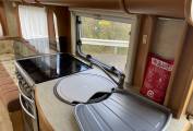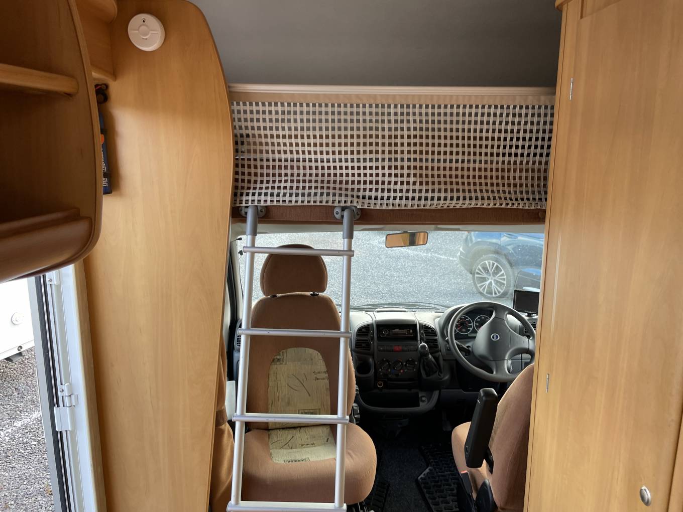 the cab allowing for everyone to have a good nights sleep. With plenty of internal storage space in the overhead lockers and under the lounge seats it is all ready for you to get everything stowed away so you can travel in comfort. This well equipped motorhome comes with a galley kitchen that has hob, sink, oven and fridge/freezer ; there is also a very good sized washroom quipped with all the facilites a family would need. In addition to this it also has a solar panel, bike rack, an external wind out awning along