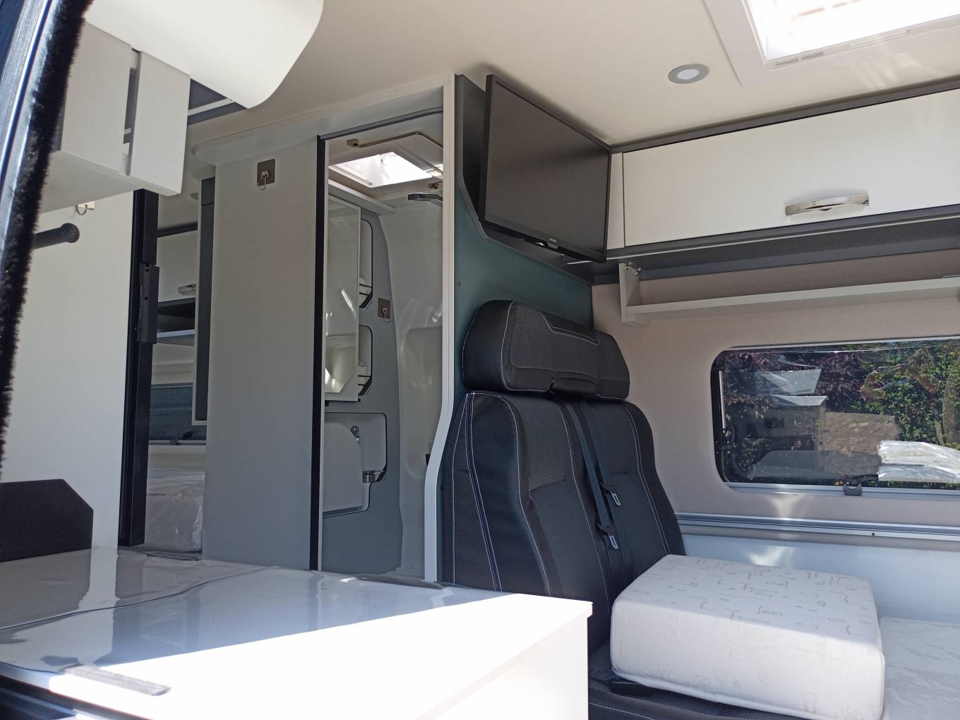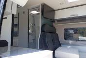 Muted tones upholstery and gloss cabinetry convey a sense of calm and space inside this campervan from the highly thought of Pilote stable.