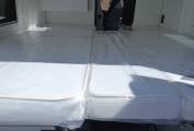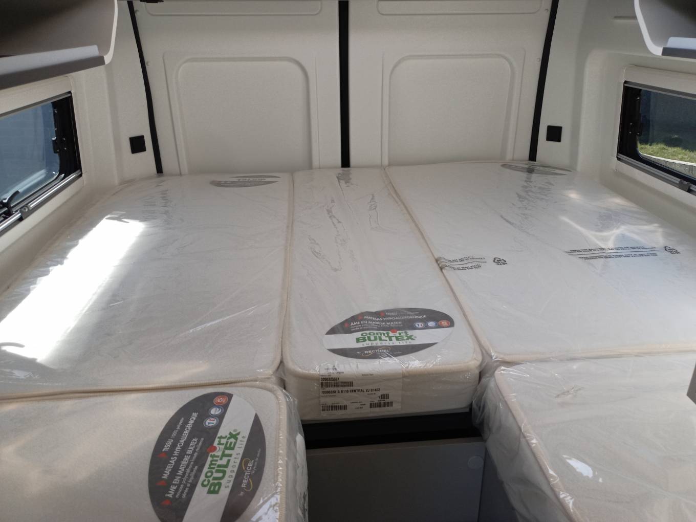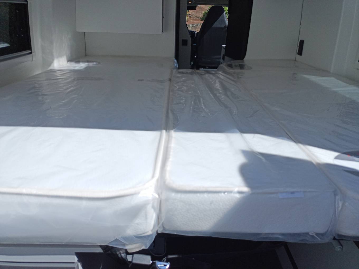 The central section of the bed can hinge out of the way to carry large loads, and its mattresses are still in the polythene wrap covers.