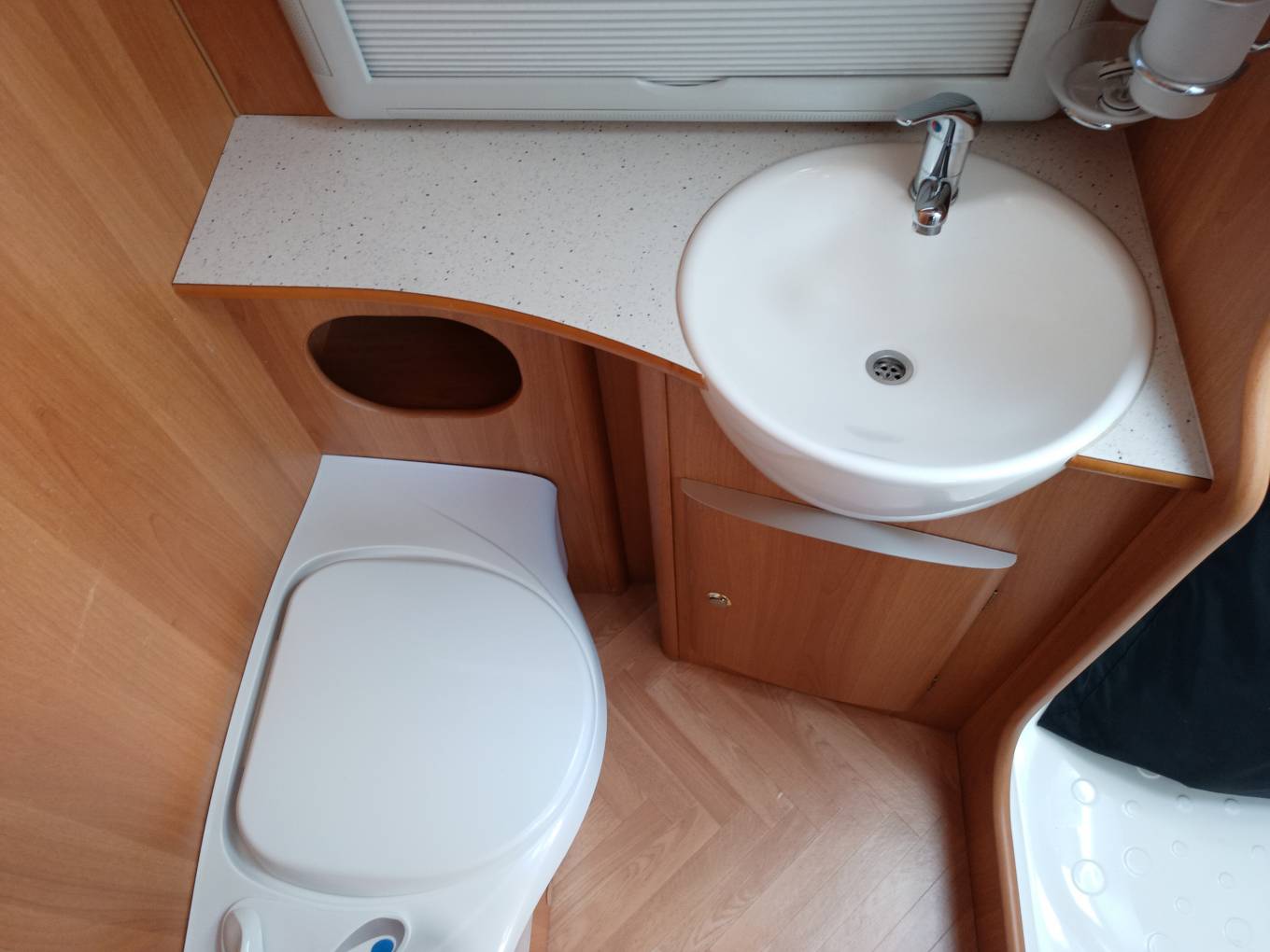 Spacious wash/shower room, with plenty of storage, and an acrylic screened shower enclosure. Extras include a satellite dish and solar panel.
